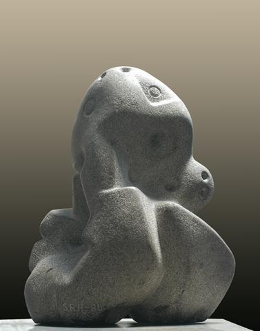 Obra tridimensional, exenta y en formato vertical. Escultura abstracta de contornos circulares que tiene diversos orificios pequeños además de dos circunferencias incisas en la zona superior derecha.