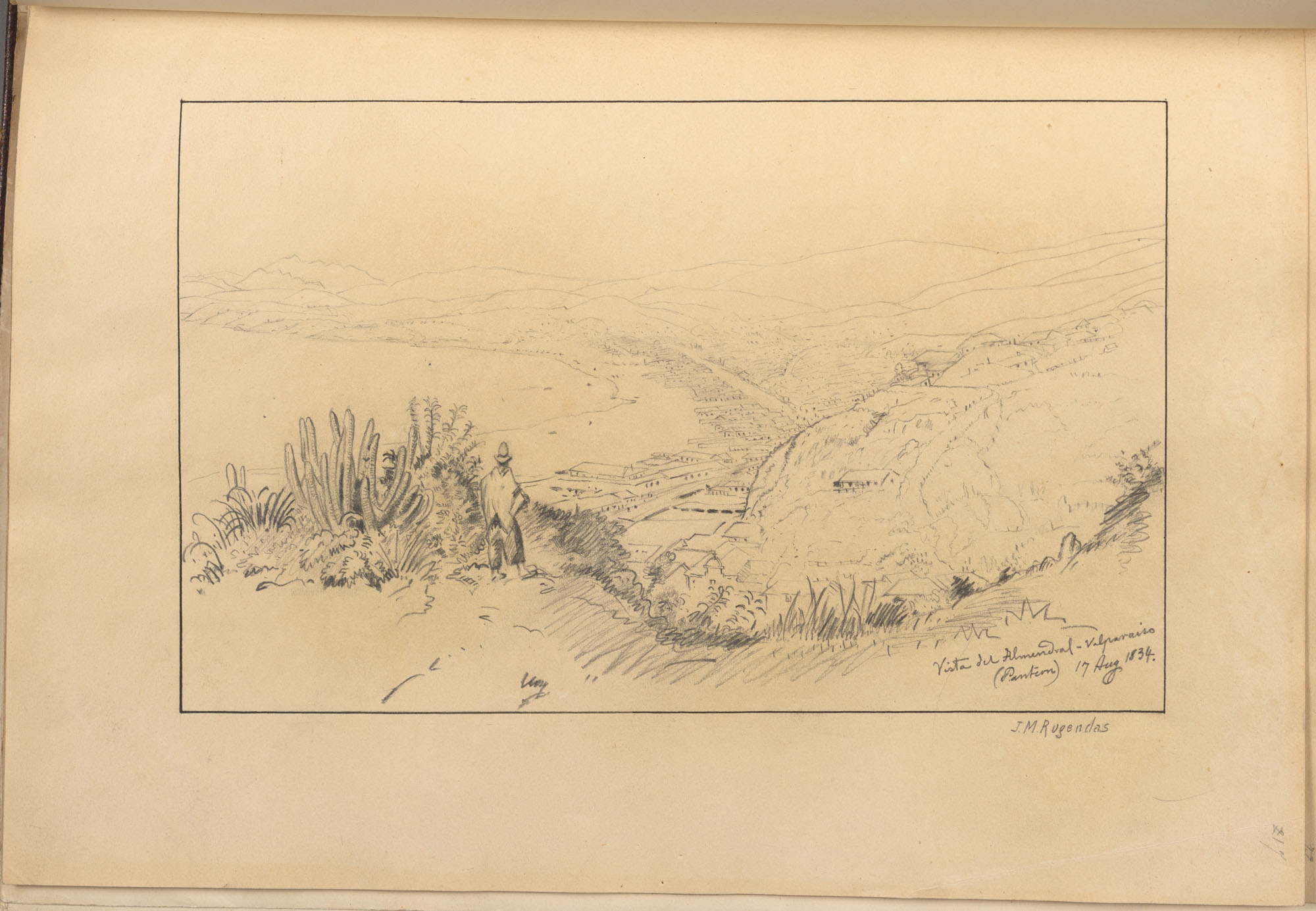 Obra de formato rectangular en orientación horizontal. Dibujo figurativo que representa una vista panorámica desde unos cerros hacia una ciudad en el plano, desde las alturas, entre algunos arbustos, es posible ver a un hombre con vestimenta campesina.