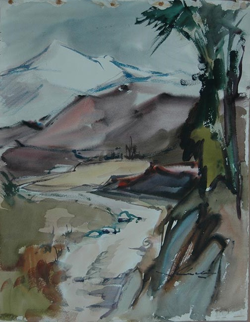 Composición rectangular, orientación vertical. Paisaje diurno antinaturalista, visto desde lo alto. Un río serpentea hacia el fondo, donde hay una gran montaña nevada. En el primer plano, a la derecha, la ladera de un cerro con un árbol que ocupa todo el alto de la composición. Predominan los colores neutros, como los grises y los ocres.