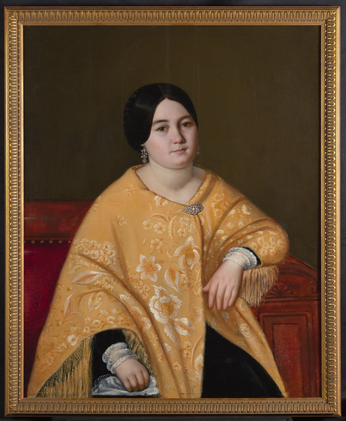 Composición rectangular, orientación vertical. Retrato de una mujer de mediana edad, representada de tres cuartos, sentada en un sofá de felpa rojo y de frente –ligeramente girada hacia la derecha-, sobre fondo neutro en tono marrón-verdoso. Tiene las facciones finas y redondas, la tez clara, el cabello negro, peinado con raya al medio y recogido; lleva pendientes colgantes; vestido negro con los puños de encaje blanco y un mantón de manila amarillo, con flores blancas y amarillo oscuro, y un broche. Con la mano derecha sostiene un pañuelo.
