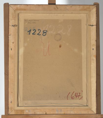 Obra rectangular, orientación vertical. Vista de taller de artista. Composición en base a figura masculina de perfil, sentada frente a un atril. En la habitación varios muebles y al fondo cuadros de distintos tamaños.