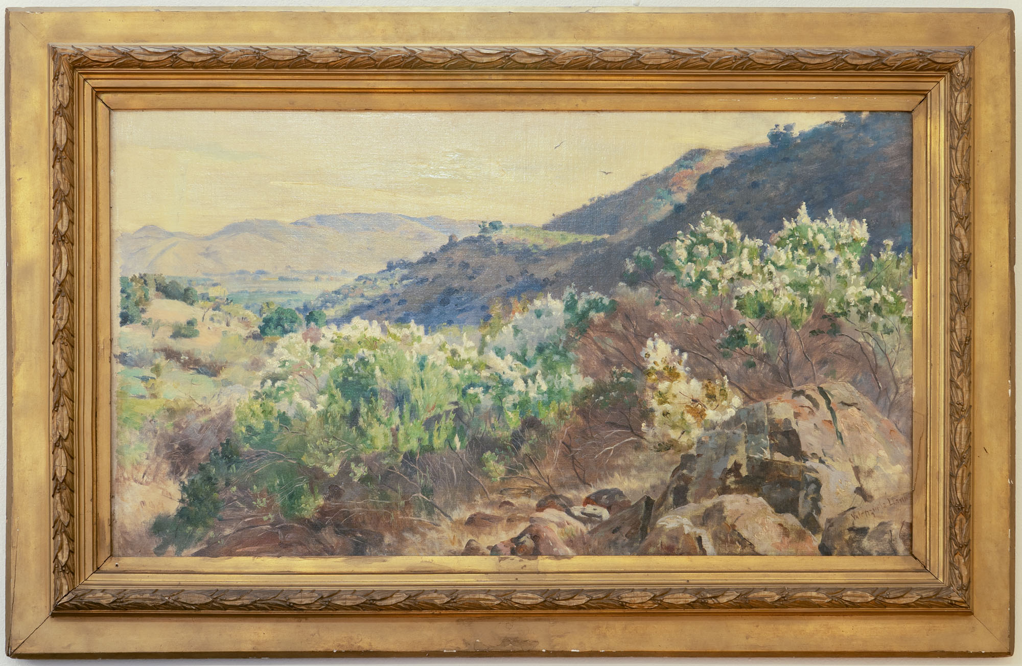 Obra de formato rectangular y orientación horizontal. Composición en base a paisaje exterior. En primer plano se distingue suelo rocoso y arbustos con flores blancas. En segundo plano hay cerros. Al fondo, sector izquierdo, se distingue parte de un valle y cordillera.