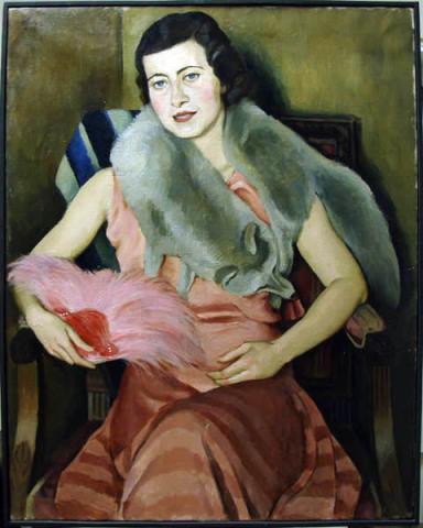Obra bidimensional, rectangular, orientación vertical. Retrato de figura femenina sentada en una silla con los brazos en los apoyabrazos. La retratada tiene el pelo oscuro, una estola de piel de zorro en los hombros, vestido en tono rosa y sostiene un abanico de plumas con su mano derecha. Fondo en tono gris y marrón.