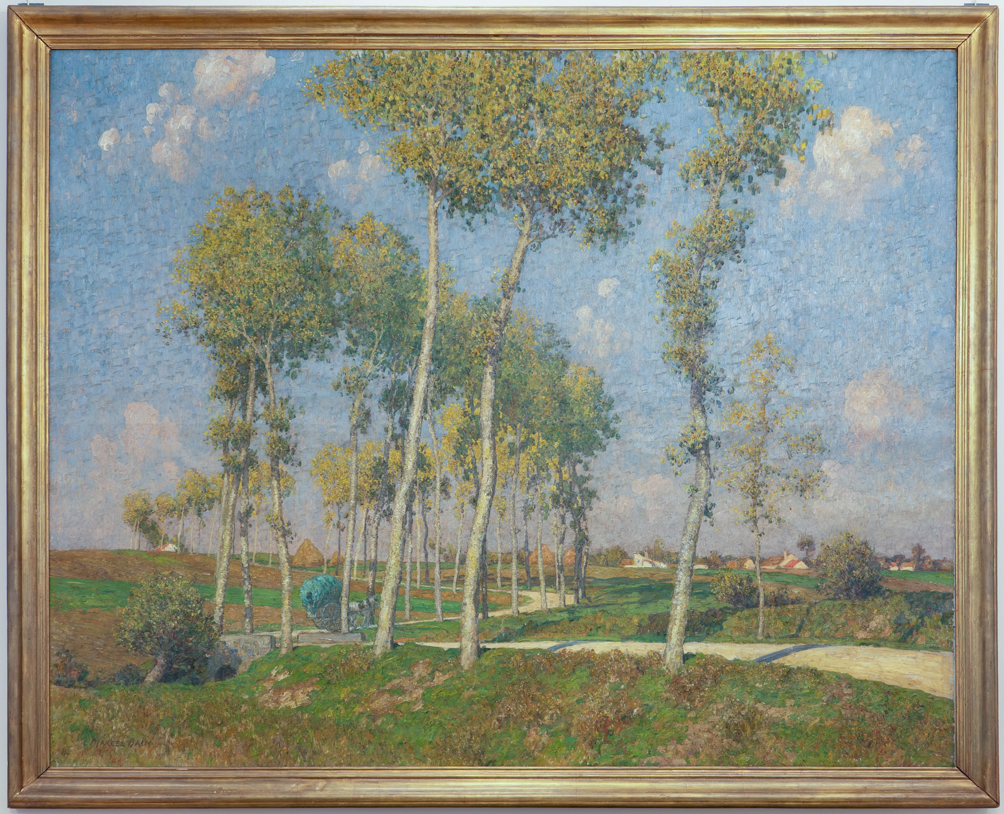 Obra de formato rectangular y orientación horizontal. Composición en base a paisaje exterior. En primer plano hay una paredera y árboles de troncos delgado a lo largo de un sendero. Al fondo, cielo nuboso celeste.