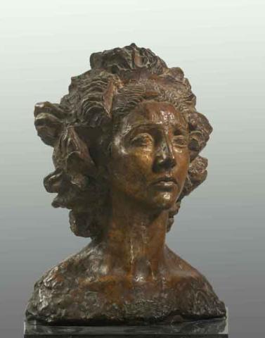 Obra tridimensional de orientación vertical. Busto de figura humana femenina de frente, pelo ondulado que se alza con desorden. La mujer presenta una inflexión en el rostro, alzando levemente las cejas y generando un rostro compungido.