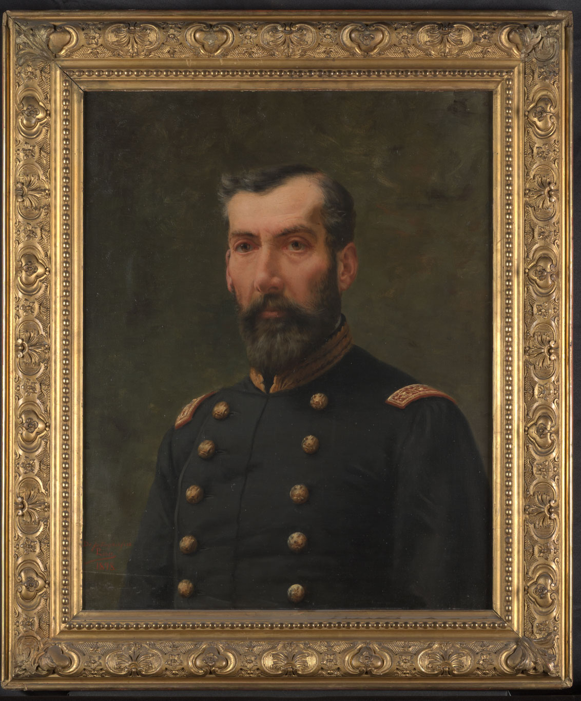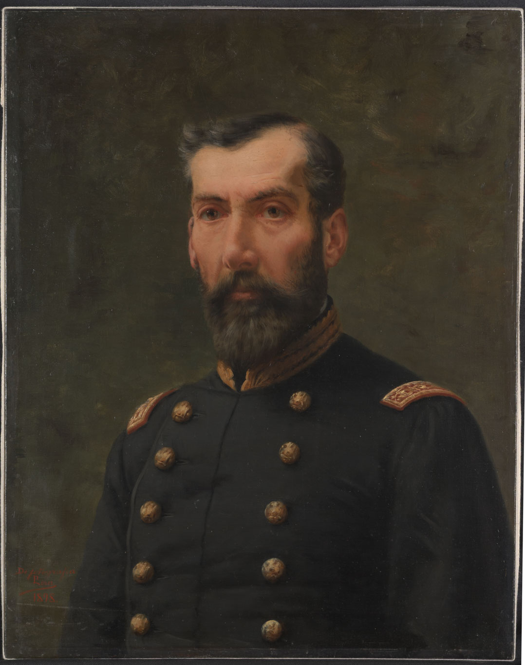 Obra de formato rectangular. Composición en base a retrato de busto masculino. El hombre viste chaqueta militar oscura con doble abotonadura y charreteras doradas. Tiene barba espesa de color gris. El fondo es de color gris.