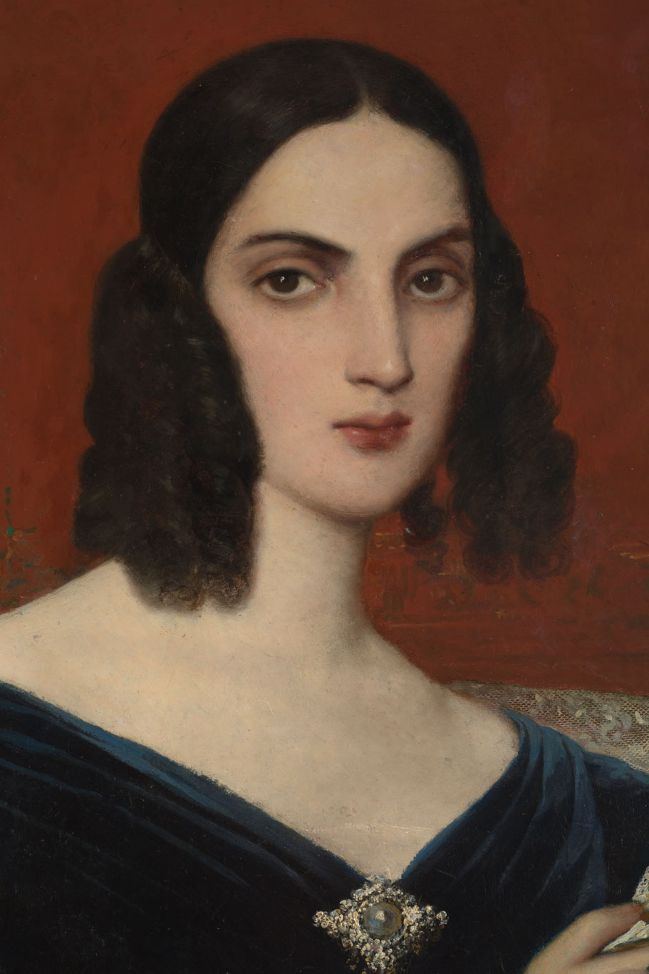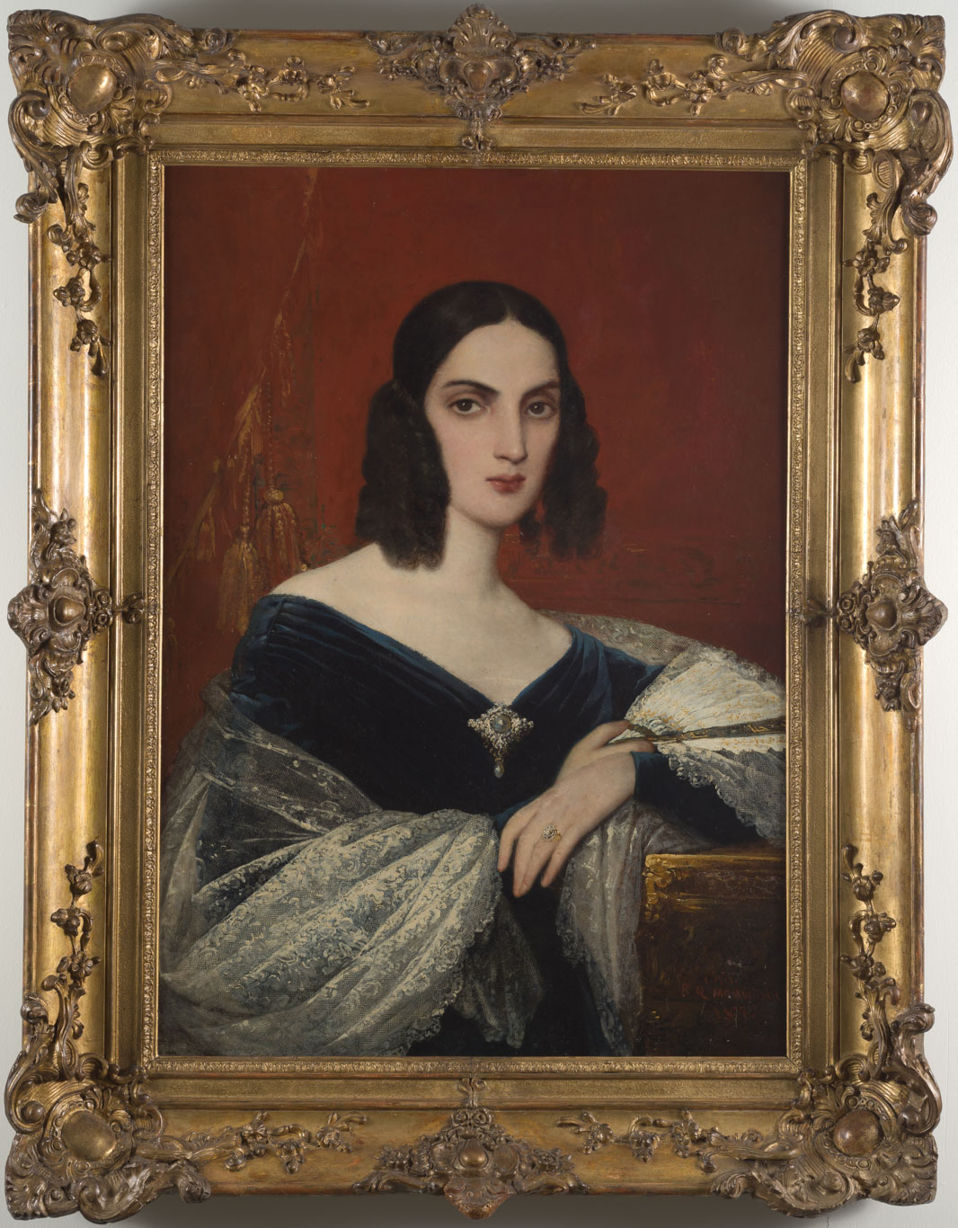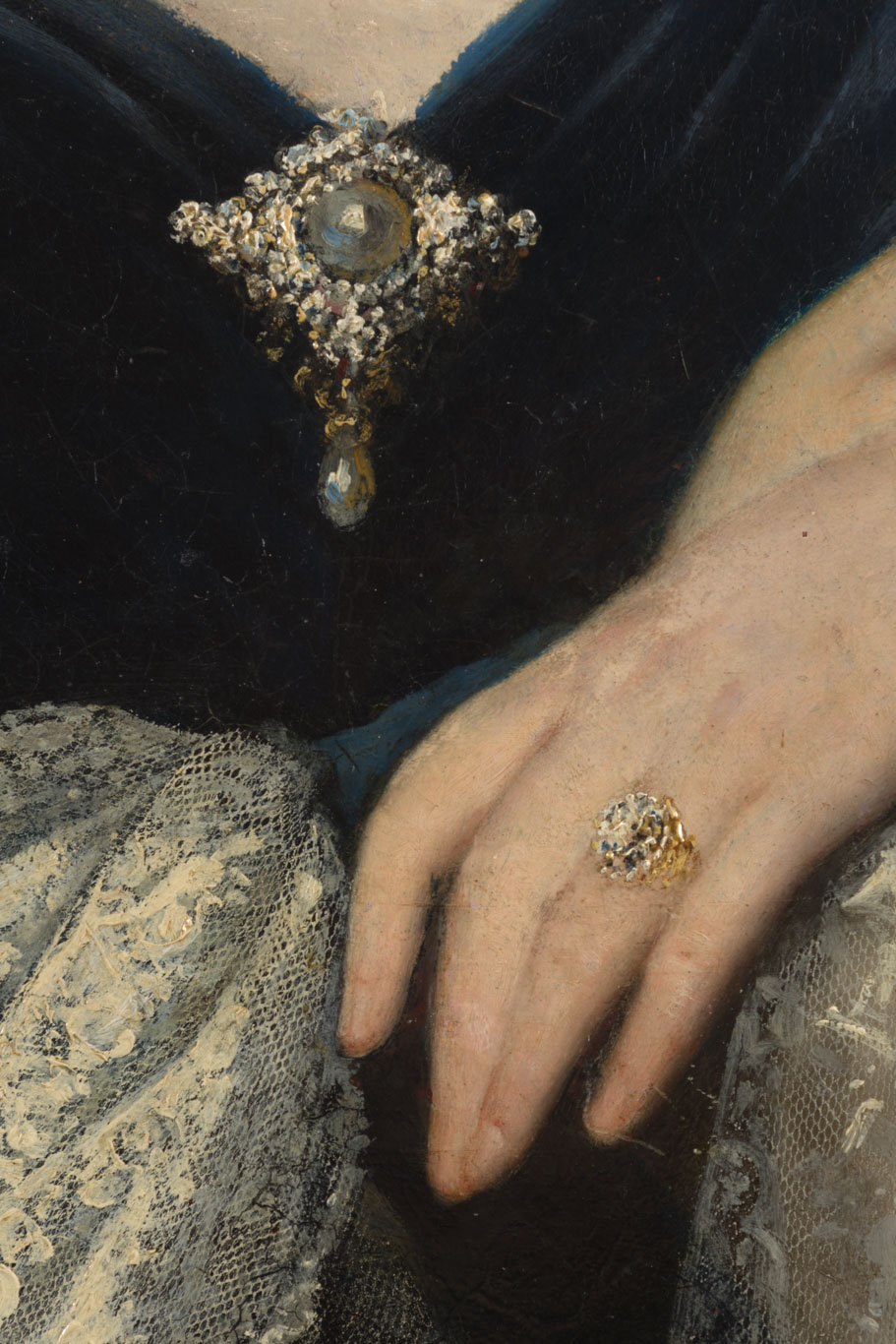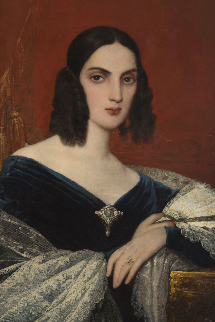 Composición rectangular, orientación vertical. Retrato de una mujer, de medio cuerpo, ligeramente girada hacia la derecha y mirando hacia el frente, sobre fondo rojizo con una cortina con borlas doradas a la izquierda. Tiene la piel blanca, el cabello castaño oscuro peinado con rizos, las cejas delineadas, la nariz afilada y la boca pequeña. Lleva un vestido negro azulado –parece de terciopelo- con amplio escote, con un broche en el centro, y un manto blanco con encajes. Se apoya sobre una estructura en la esquina inferior derecha, lleva un anillo en el anular izquierdo y aguanta un abanico medio abierto con la mano derecha.
