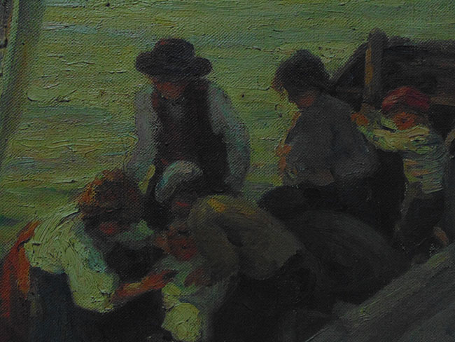 Obra de formato rectangular en orientación horizontal. Pintura figurativa, policromática que representa un escena costumbrista. Se observa un conjunto de personas descendiendo de un bote hacia una escaleras. Al centro, un niño pequeño, de cabellos rubios es conducido suavemente por la mujer que está a sus espaldas y un hombre lo coge. Otros tres adultos y un niño acompañan la escena.