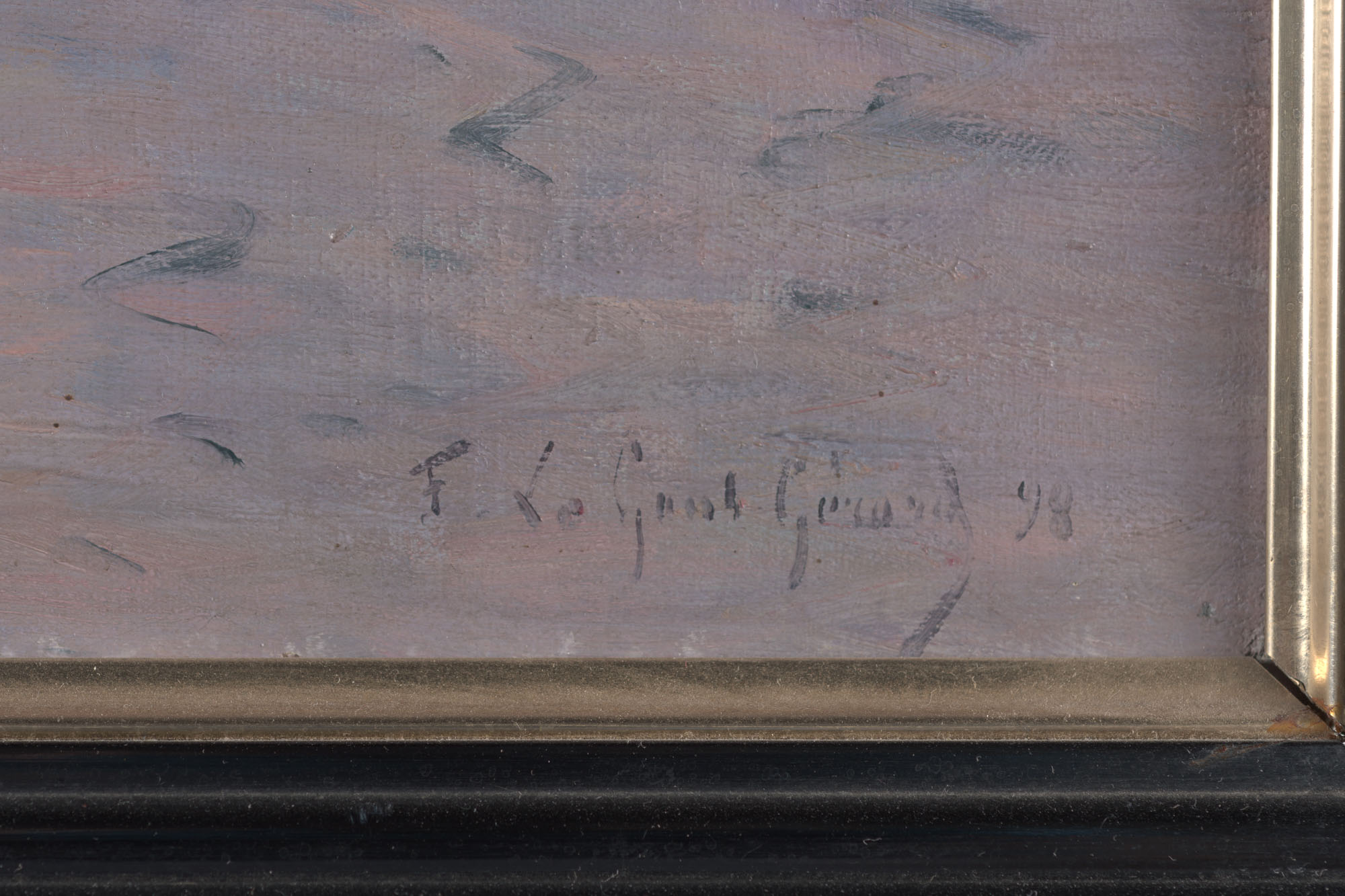 Obra de formato rectangular y orientación horizontal. Marina. Composición en base a paisaje fluvial. En primer plano varias embarcaciones. Al fondo, se ve un poblado. El cielo es nuboso.