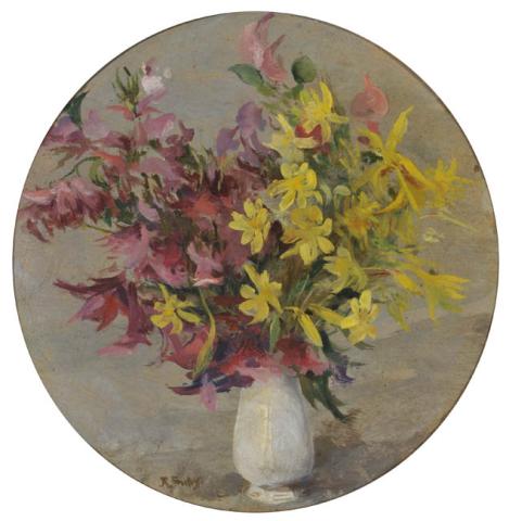 Obra circular. Composición en base a florero blanco con abundantes flores moradas y lilas. Fondo grisáceo.