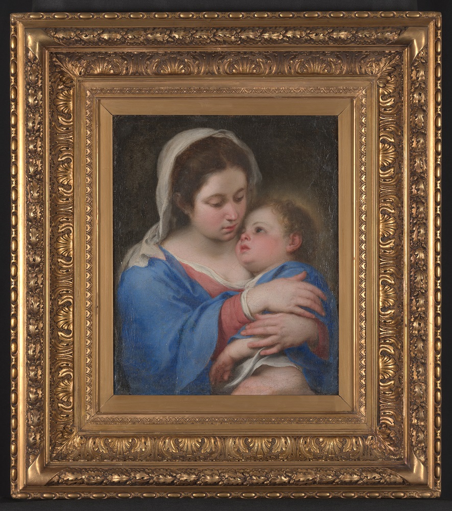Obra de formato rectangular y orientación vertical. Composición de temática religiosa en base a retrato de figura femenina, y figura infantil con un tenue nimbo dorado alrededor de su cabeza. La figura femenina viste un vestido rojizo con un manto azul y un maforion blanco en su cabeza. Observa, sostiene con ambas manos y cubre con el manto a la figura infantil.