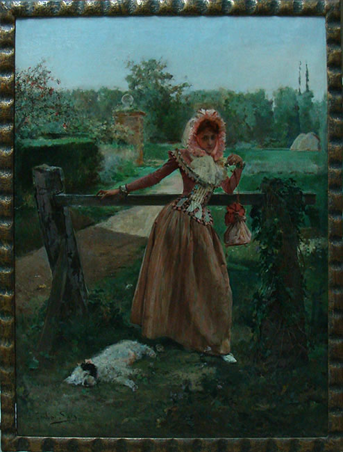Obra bidimensional de formato rectangular en orientación vertical. Pintura figurativa, policromática,que representa un retrato femenino de cuerpo completo en un paisaje rural. La mujer, de vestido largo rosado, con golilla, encajes, bolsa y sombrilla, se encuentra apoyada junto a un cerco de madera. A sus pies reposa un perro sobre el césped.