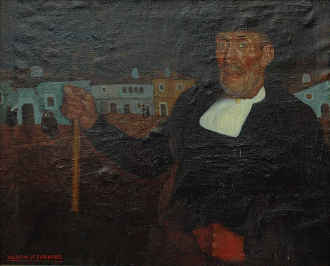 Obra bidimensional de formato rectangular en orientación horizontal. Pintura figurativa, policromática, que representa el retrato a medio cuerpo de un hombre anciano. El sujeto con sombrero, ropajes negros y cuello blanco, extiendo su brazo derecho para sostener un bastón. A sus espaldas una ciudadela con caseríos y transeúntes de capas alargadas negras.