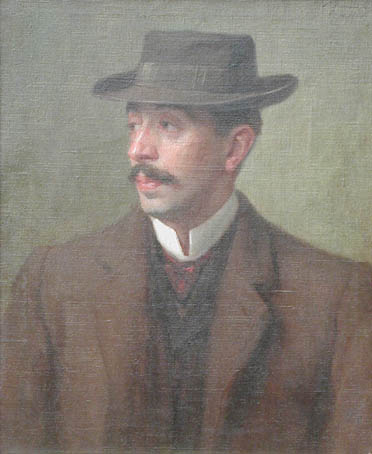 Composición rectangular, orientación vertical. Retrato de busto de un hombre, ocupando gran parte de la composición. Tiene el cuerpo de frente y la cabeza de medio perfil hacia la izquierda. Lleva sombrero marrón de ala estrecha y viste chaqueta marrón chocolate, bajo la cual se asoma otra prenda marrón oscuro con cuello pico, pañuelo marrón con manchas rojas y cuello de camisa blanco. Tiene el cabello corto y castaño, las cejas arqueadas, los ojos cansados, la nariz grande, los labios carnosos y lleva bigote. El fondo es neutro, de color verde grisáceo.
