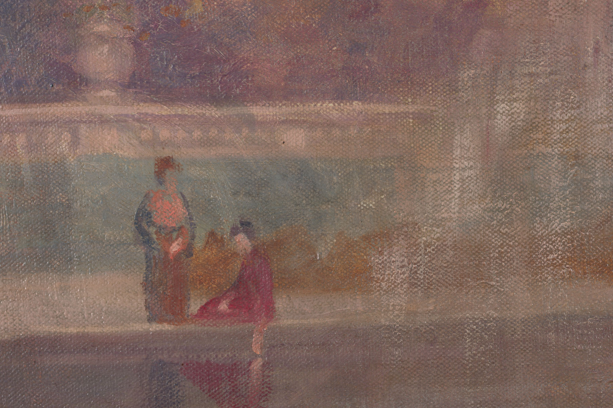 Obra de formato rectangular y orientación horizontal. Composición en base a escena exterior. En primer plano, hay una fuente de agua circular. En segundo plano, al centro, hay dos figuras femeninas. Al fondo balaustrada y árboles frondosos.