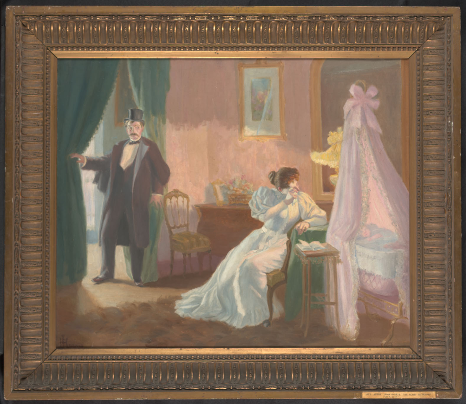 Representación de una habitación, con tres personajes retratados, con iluminación artificial. En el centro, una mujer sentada junto a una cuna con un bebé -a la derecha- y un hombre de pie a la izquierda, en un plano más lejano. La mujer está representada con el cuerpo de frente y la cabeza gacha de perfil, llevándose la mano derecha al rostro; tiene el cabello castaño y lo lleva recogido en un moño; lleva un vestido largo blanco, de manga larga con los hombros abombados. Apoya el brazo izquierdo sobre una mesa con mantel verde, al lado de una lámpara de mesa, delante de la cual está la cuna -con dosel rosa- con el bebé, de quien solo se ve el rostro. El hombre está representado de frente, levemente girado hacia la izquierda y mirando a la mujer; es castaño y tiene bigote, viste traje negro, con camisa blanca, pajarita y sombrero de copa; con las manos sujeta unas cortinas verdes abiertas hacia otra estancia. Al fondo hay una cómoda con una canastilla arriba, una silla y un cuadro.