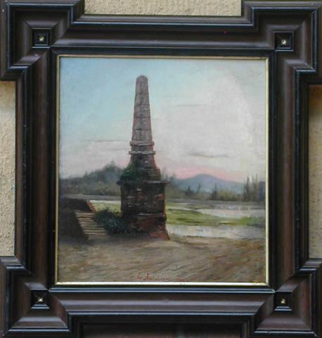 Obra rectangular, orientación vertical. Composición en base a pirámide de piedra, larga y angosta, ubicada al centro, a la izquierda una escalera. En segundo plano valle y al fondo montañas y árboles. Cielo despejado.