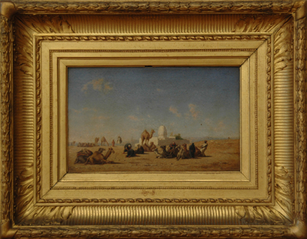 Obra de formato rectangular en orientación horizontal. Pintura figurativa policromática que representa una escena de exterior ante un paisaje árido y desértico. Se observa en primer plano un conjunto de hombres y camellos reposando sentados, mientras al fondo se divisa una mezquita de color blanco.