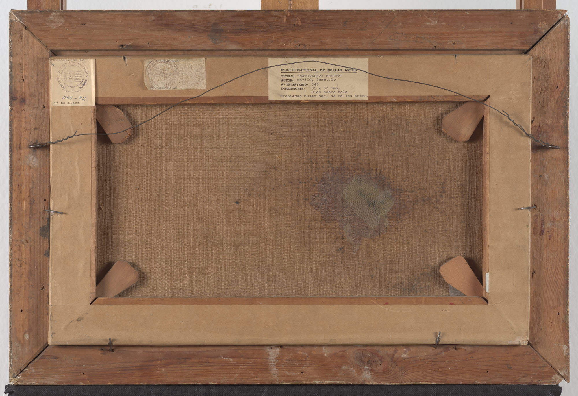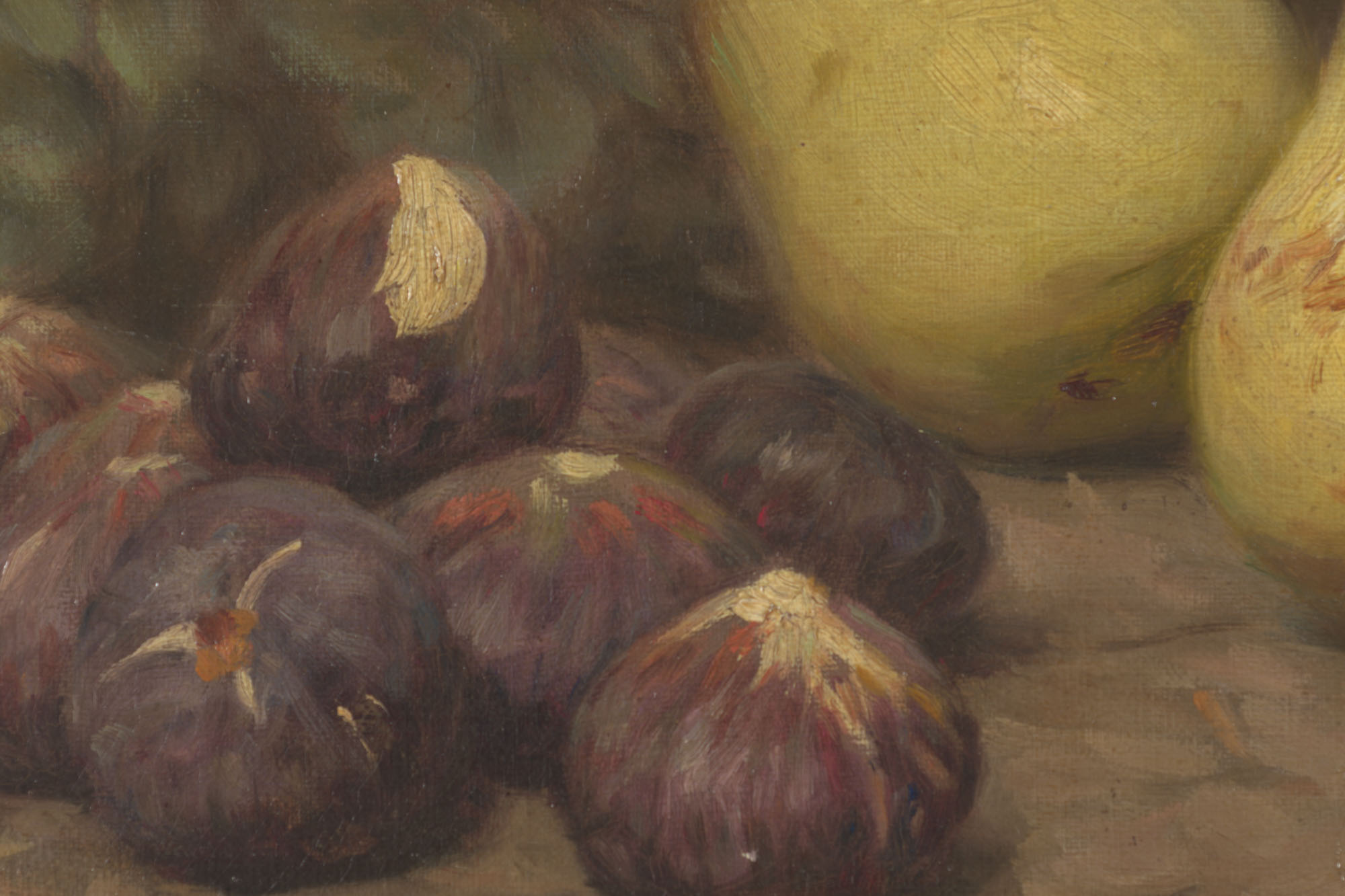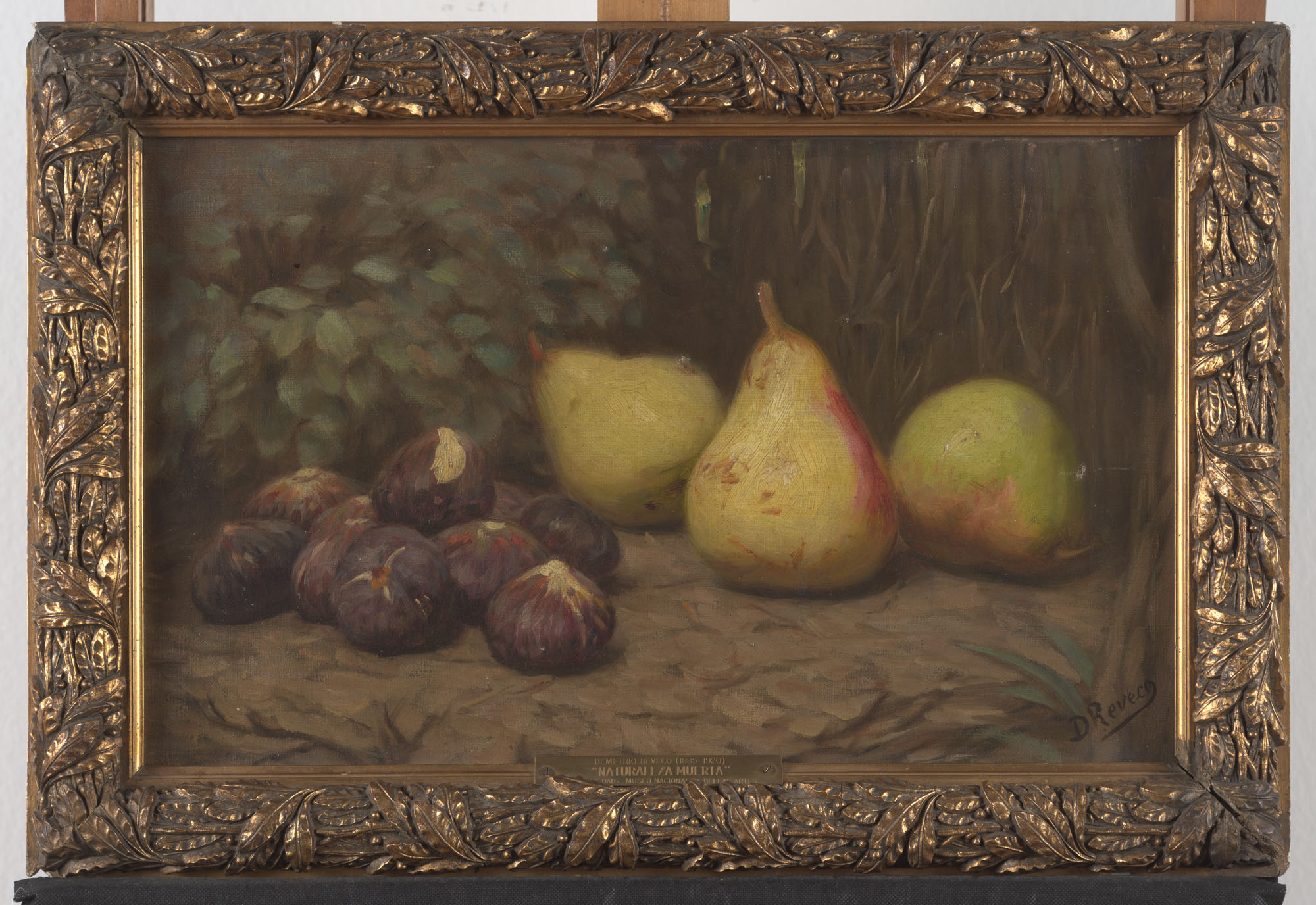 Obra de formato rectangular y orientación horizontal. Composición en base a naturaleza muerta, formada por higos y peras. En el fondo se disingue follaje.