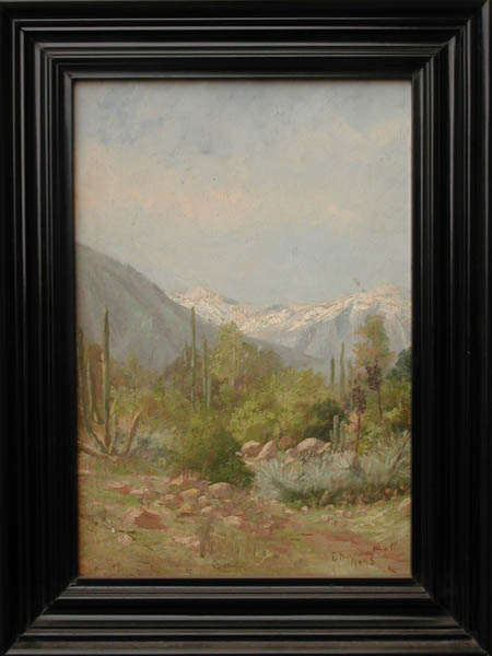 Obra bidimensional, rectangular, orientación vertical. Paisaje con matorrales verdes y piedras, al fondo se distingue montaña nevada. Cielo azul claro. Enmarcado.