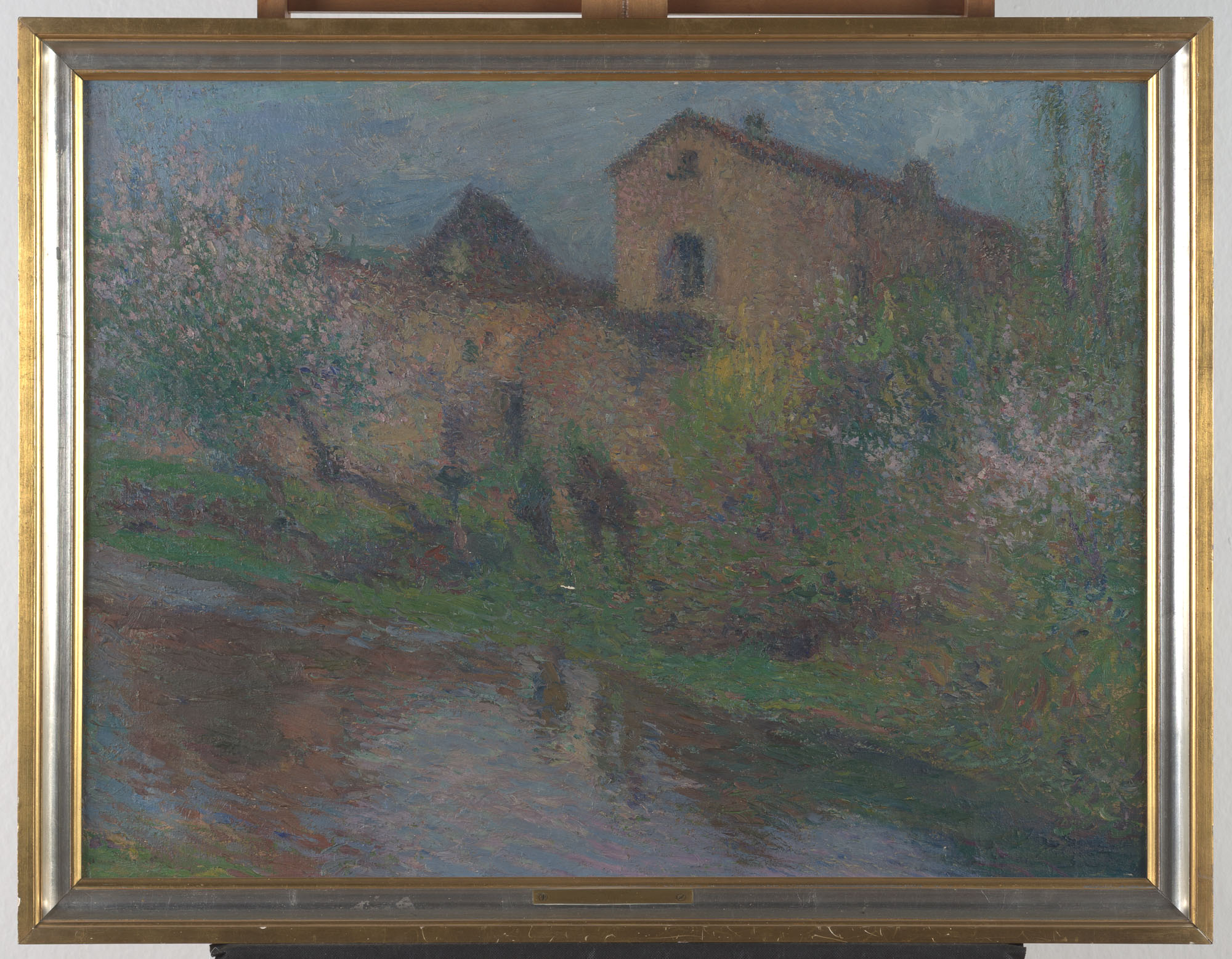 Obra de formato rectangular y orientación horizontal. Composición en base a paisaje campestre. En primer plano se observa un riachuelo rodeado por vegetación. Al fondo una construcción compuesta por dos volúmenes. El cielo es nuboso.
