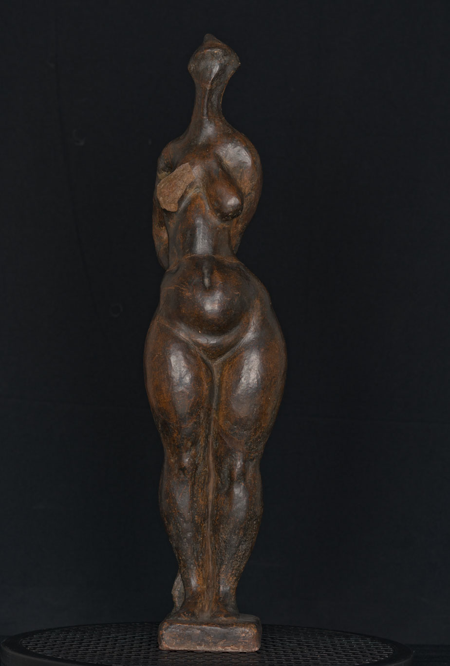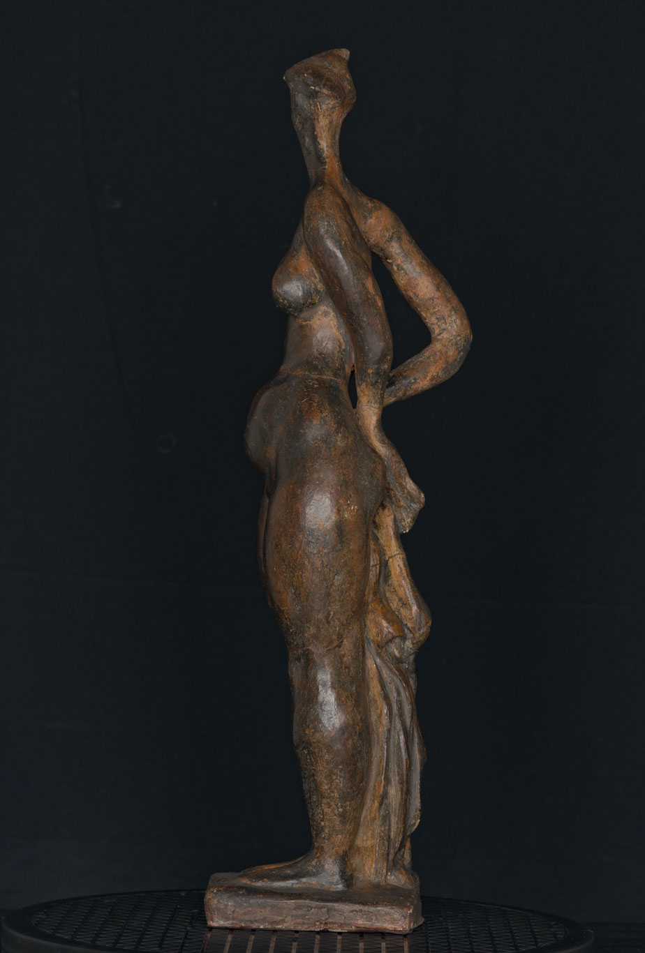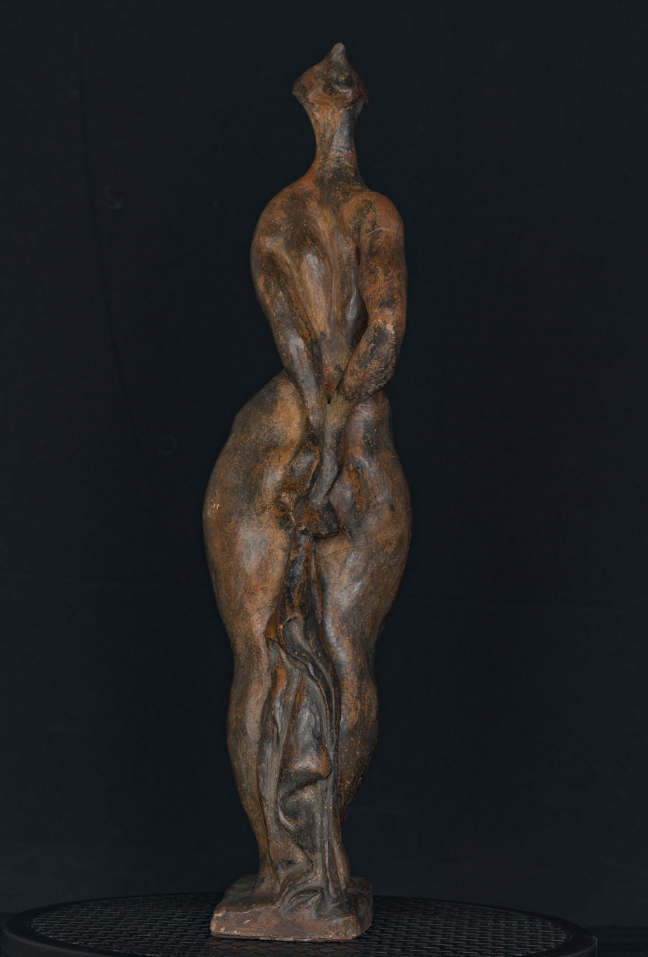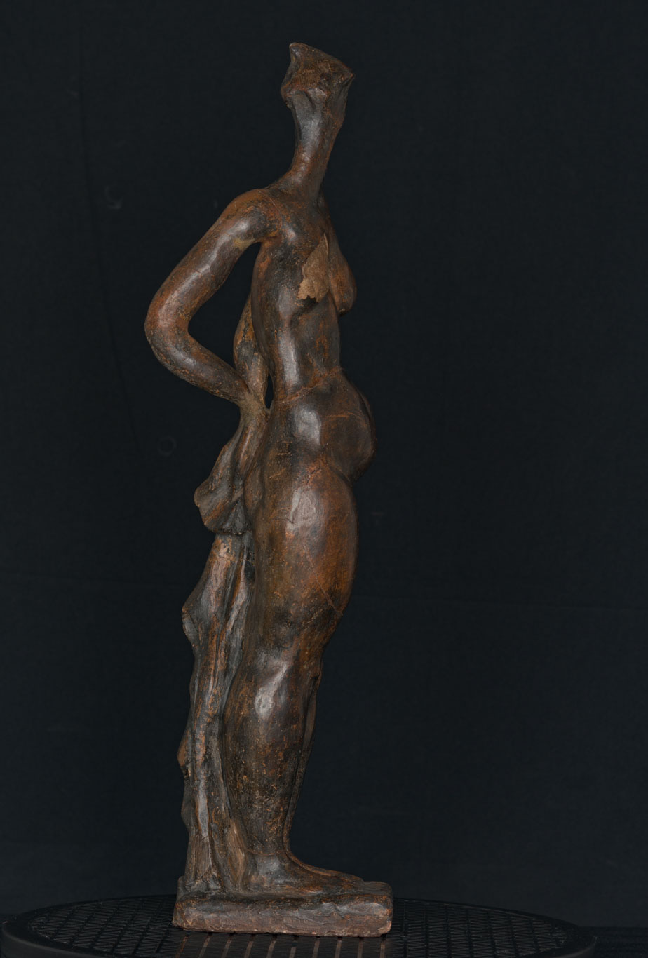 Obra exenta. Composición en base a figura femenina estilizada levantada sobre una base cuadrangular. El cuerpo es alargado y serpenteante con diversas zonas abultadas en las piernas, caderas, estómago, pechos y hombros. Los brazos los tiene en la espalda sosteniendo una tela. La cabeza es pequeña y no posee rostro.