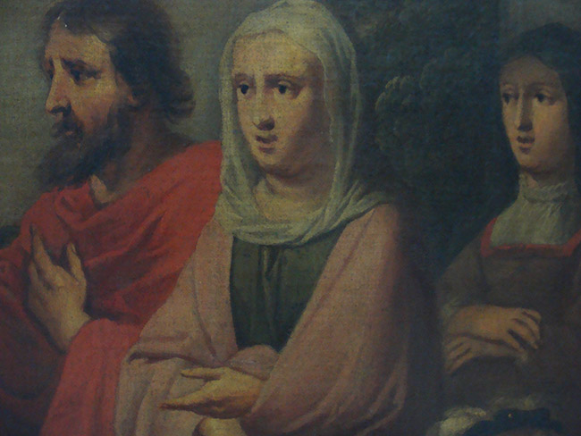 Obra de formato rectangular, orientación horizontal. Retrato grupal. Composición en base a figura femenina ubicada al centro de la imagen, de rodillas frente a una figura masculina con investiduras. A la derecha de la imagen conjunto de personajes de pie, observando la escena, una de ellas embarazada. Todas las figuras visten túnicas y las mujeres llevan el cabello cubierto.