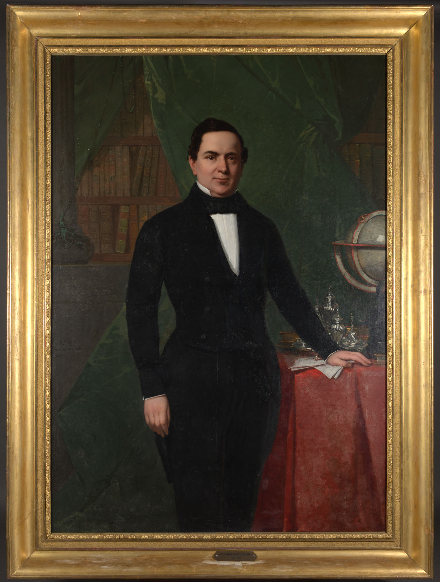 Composición de formato rectangular y orientación vertical. Retrato de tres cuartos de un hombre de mediana edad, visto de medio perfil derecho y con la mirada hacia el frente. Viste levita y pantalón negros, con camisa blanca y corbatín. Apoya la mano izquierda sobre una mesa cubierta por mantel rojo, sobre la cual hay un globo terráqueo -el cual excede el margen derecho de la composición-, recipientes de plata -tintero y otros- sobre una bandeja, documentos y libros. Al fondo hay un cortinaje verde, tras el cual se asoman repisas con libros.