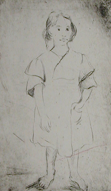 Obra de formato rectangular en orientación vertical. Grabado figurativo, monocromático, que representa el retrato frontal, cuerpo completo, de una niña. La pequeña se encuentra usando un vestido ancho hasta las rodillas y tiene su mano izquierda dentro de un bolsillo. Su pelo tomado en una cola luce algo desordenado y se encuentra descalza. El grabado tiene una línea suelta y ágil sobre fondo blanco.
