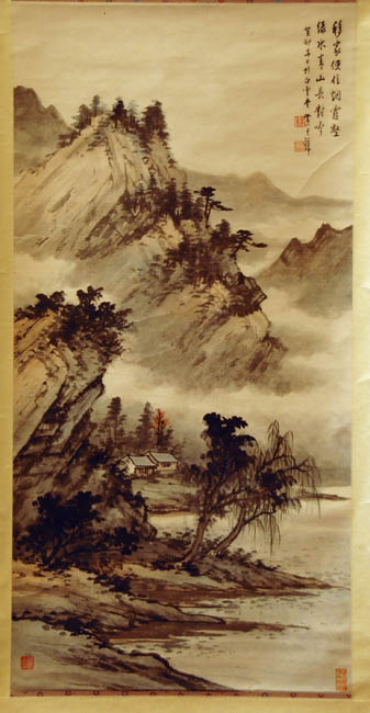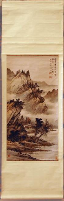 Obra de formato rectangular y orientación vertical. Composición en base a paisaje con un escrito en la esquina superior derecha. En primer plano, la orilla de un cuerpo de agua con árboles y arbustos. Al fondo montañas y nubosidad.