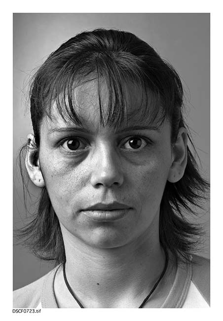 Políptico compuesto por 17 fotografías rectangulares, orientación vertical, imagen blanco y negro. Cada pieza corresponde a un retrato en primer plano, vista frontal, de distintas figuras femeninas. Se identifica una inscripción compuesta por letras y números que termina ".tif" en el margen inferior izquierdo de cada fotografía.