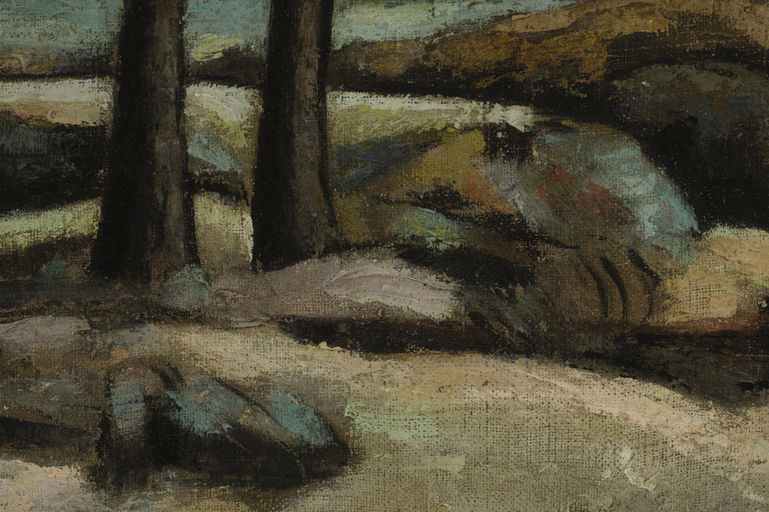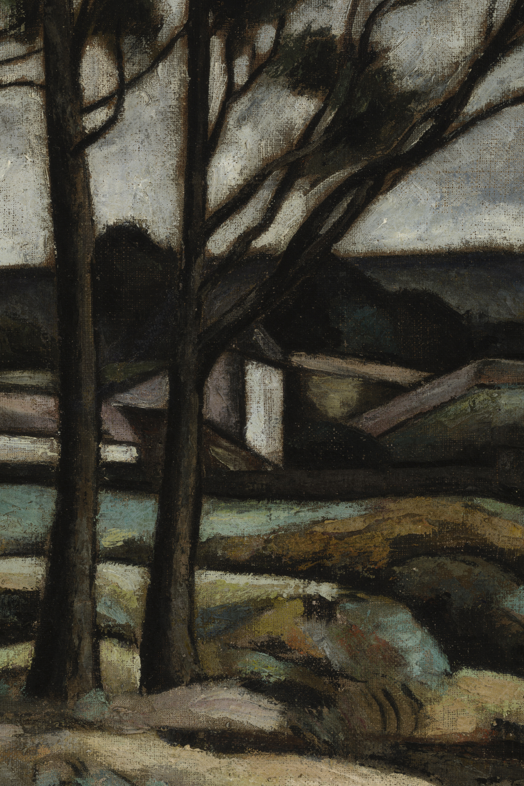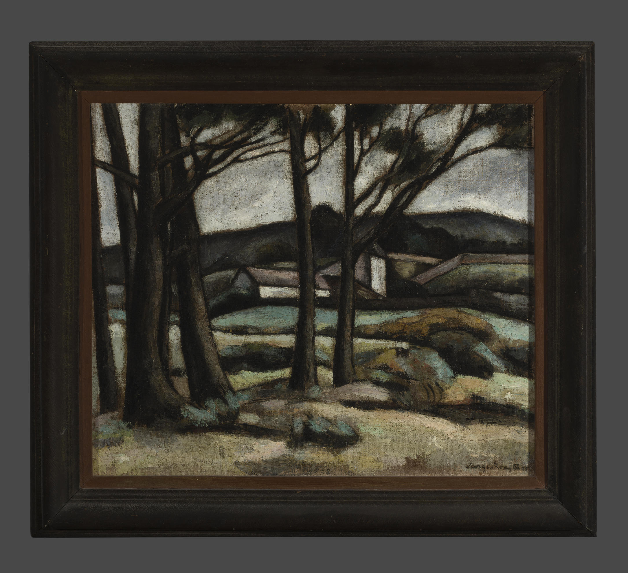 Obra bidimensional, rectangular, orientación horizontal. Línea del horizonte en el sector central de la obra. En primer plano troncos delgados en tonos oscuros. En segundo plano se distingue una casa entre las lomas.