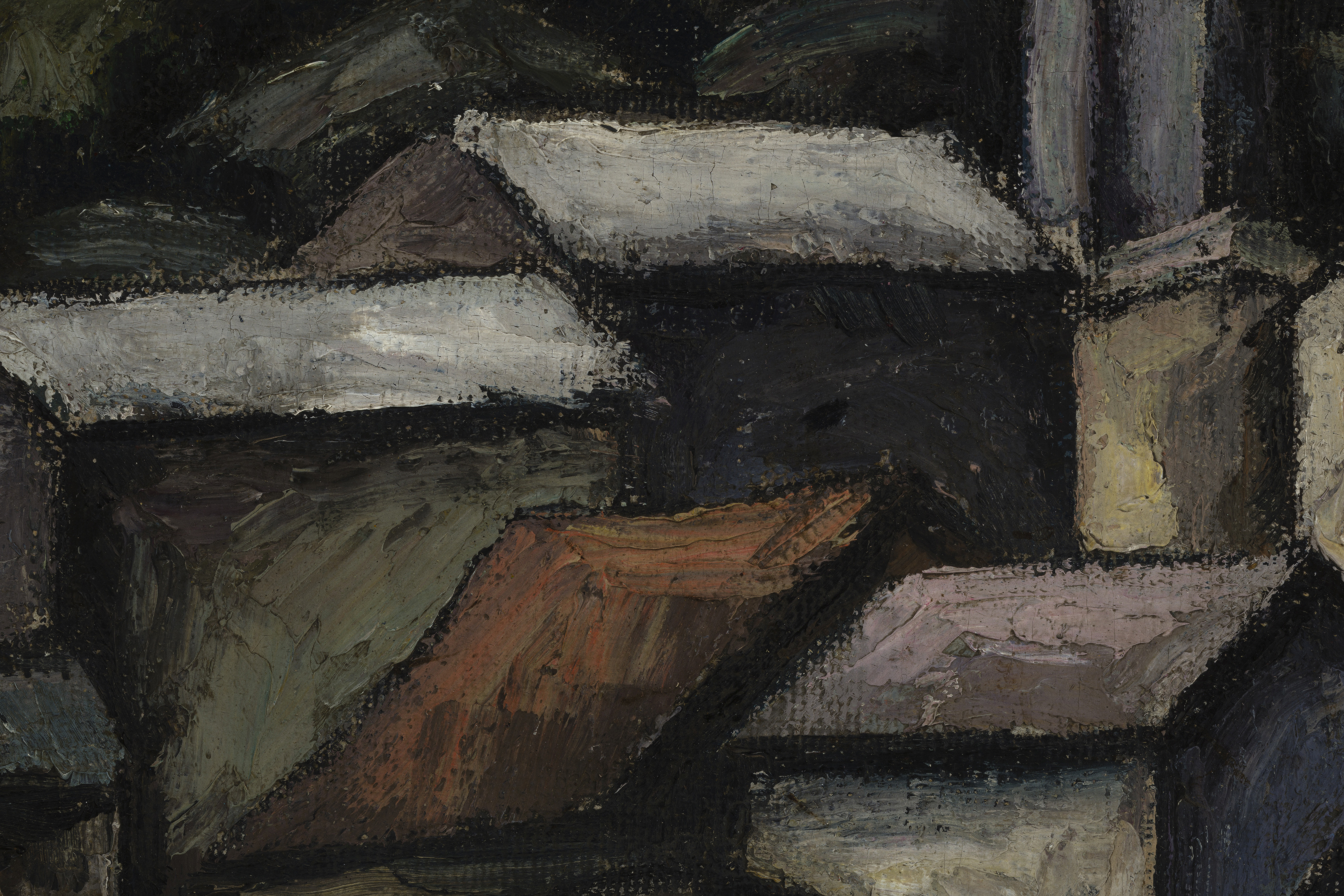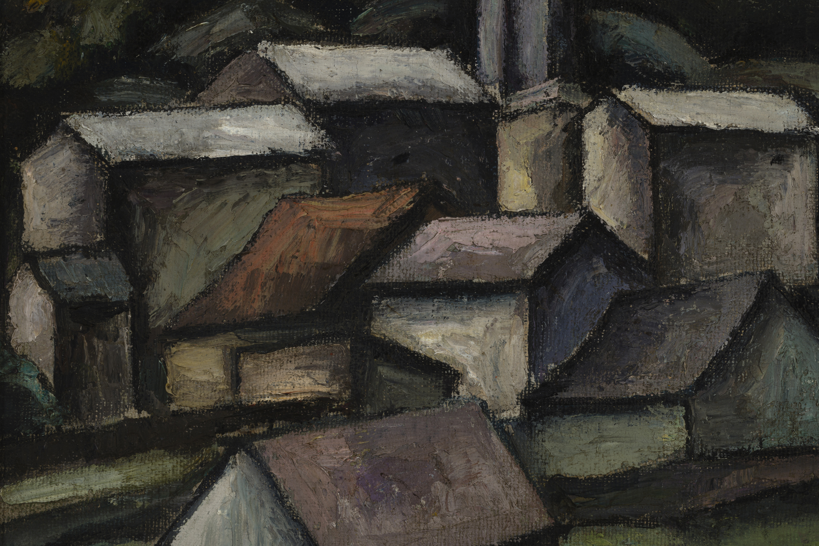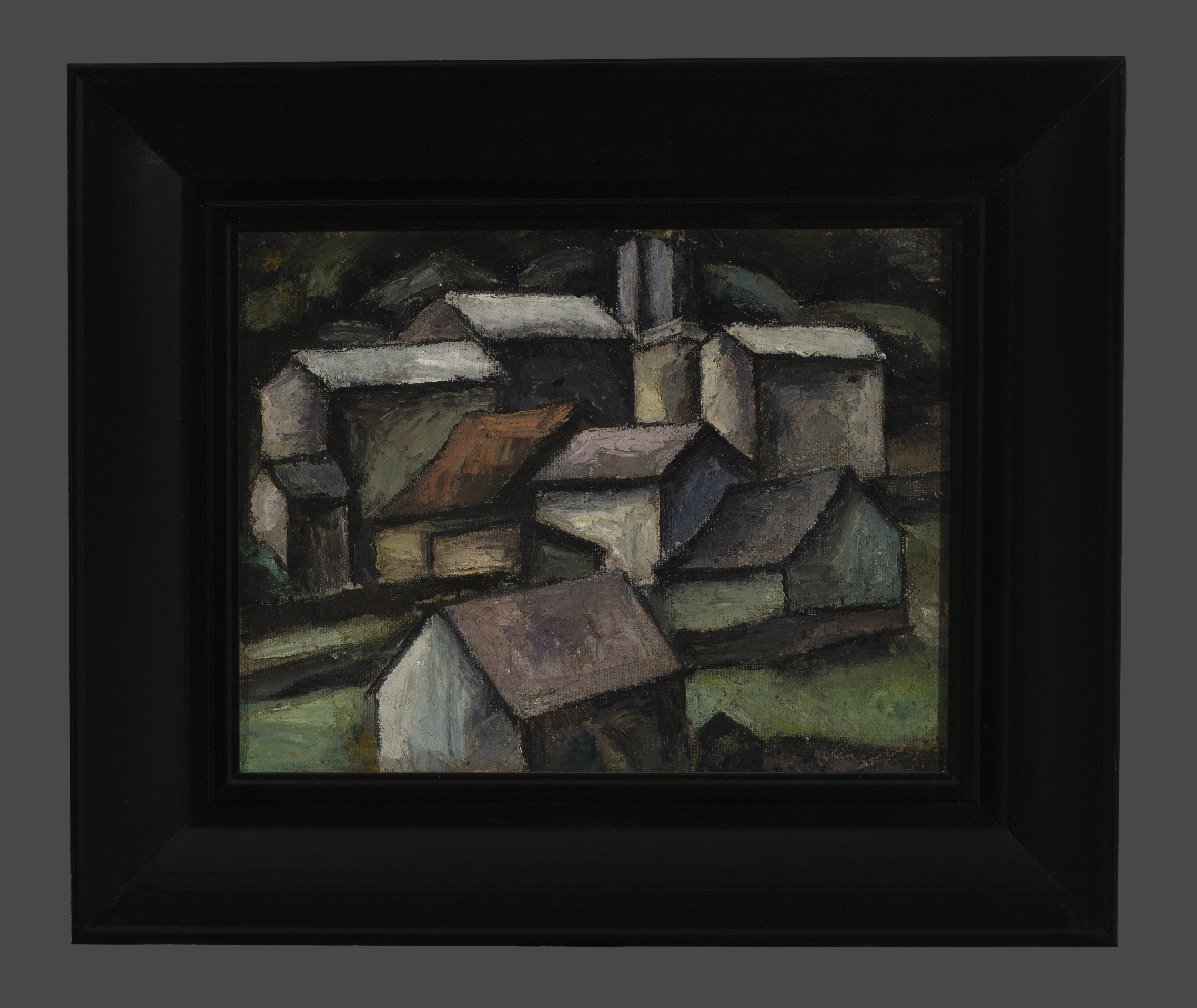 Obra bidimensional, rectangular, orientación horizontal. Composición en base a vista de conjunto de casas en pendiente. Las casas son de distintas dimensiones y tienen techos de dos aguas. Predominio de tonos oscuros y negro.