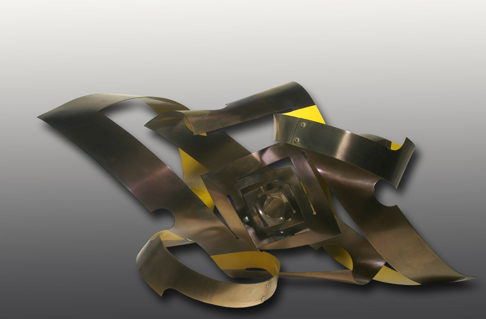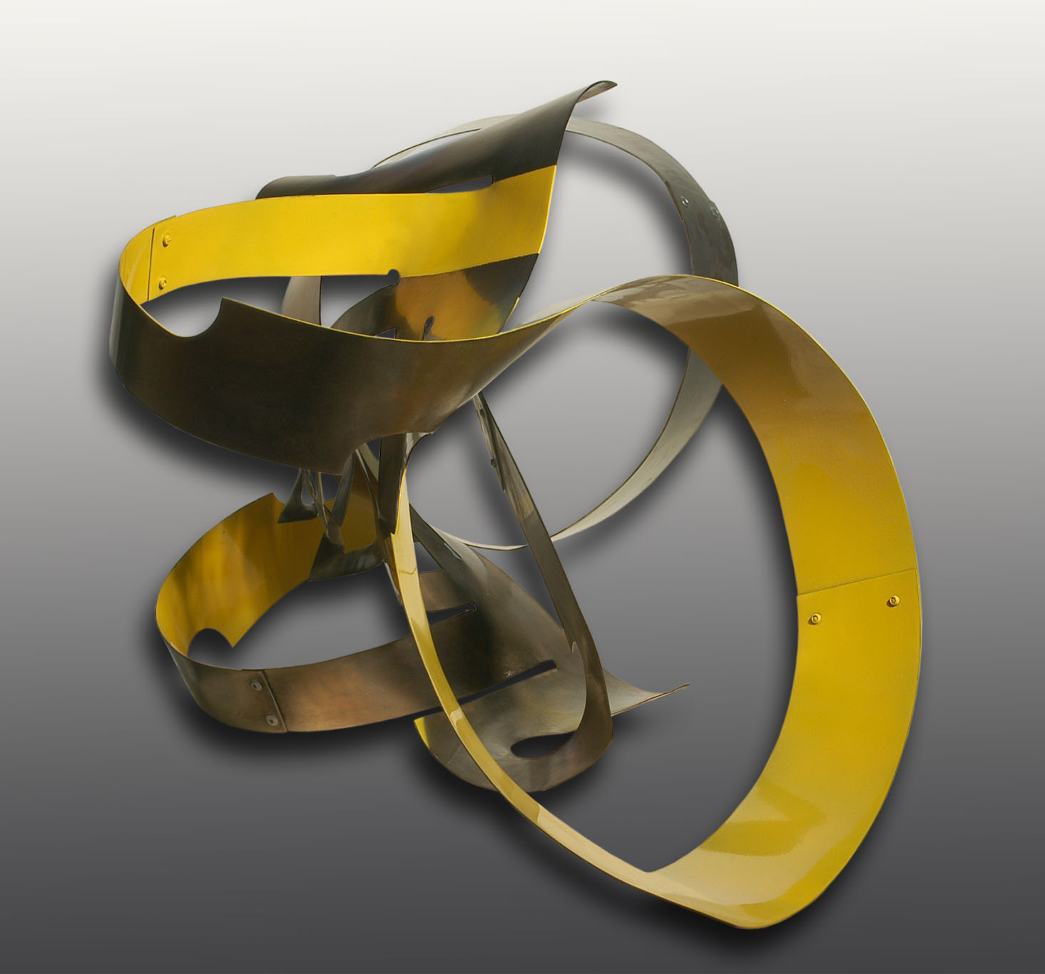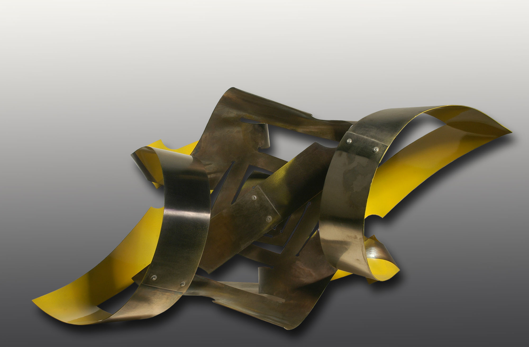 Obra exenta compuesta por franjas de metal anidadas que forman círculos y enlaces en distintas direcciones. Las franjas aportan movimiento a la figura y son de color metálico y amarillo.