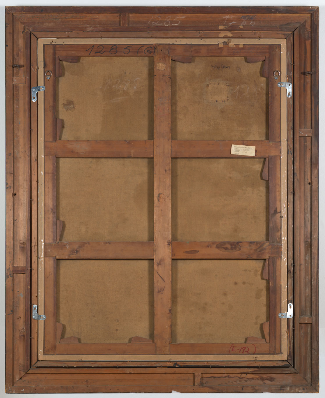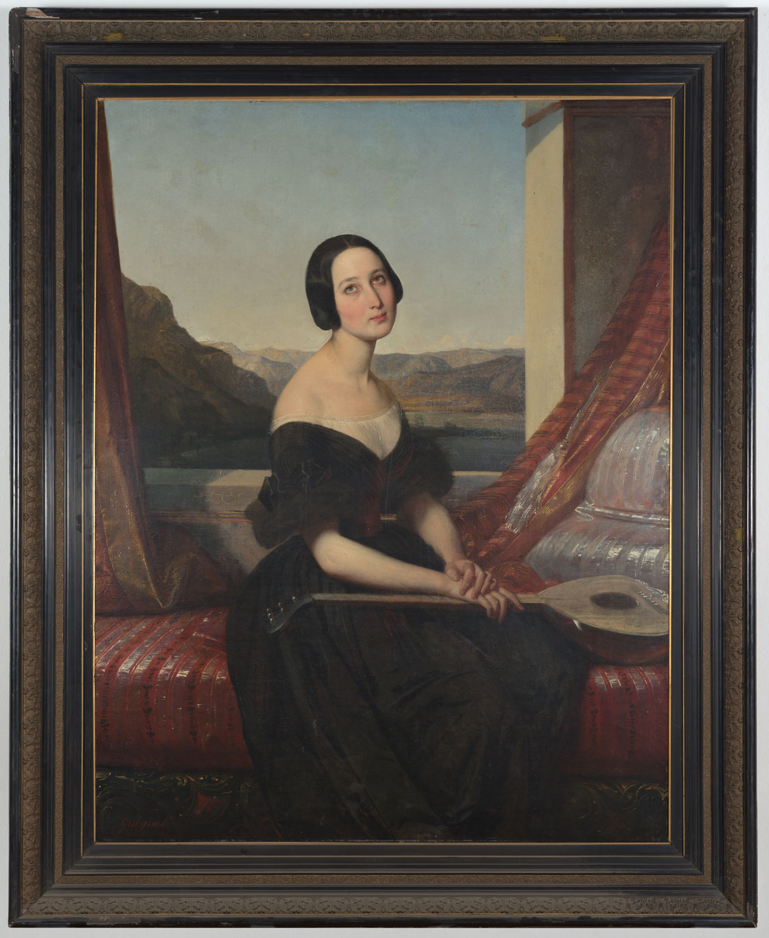 Obra rectangular, orientación vertical. Retrato de figura femenina sentada, con la mirada dirigida hacia arriba y con un laúd sobre su falda. La figura viste un vestido negro con hombros al descubierto. Tiene el pelo negro y recogido. Largas cortinas recogidas a ambos lados de la composición. Tras la retratada se distingue una vista de un paisaje montañoso.