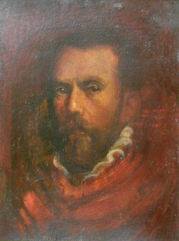 De formato rectangular, composición figurativa vertical que representa retrato de figura masculina de busto y medio perfil. Golilla en cuello y traje rojo. Usa Barba y profuso bigote.