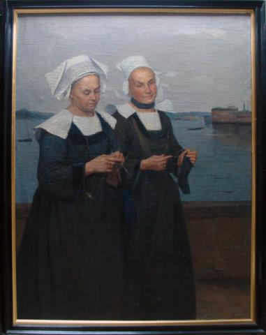 Obra bidimensional, rectangular, orientación vertical. Línea del horizonte en el tercio superior de la obra. Retrato de dos figuras femeninas de pie, medio perfil derecho. Las figuras llevan largos vestidos negros de faldón amplio, con cuellos y cofias blancas, ambas tejen con palillos. En segundo plano se distinguen embarcaciones. Cielo gris.