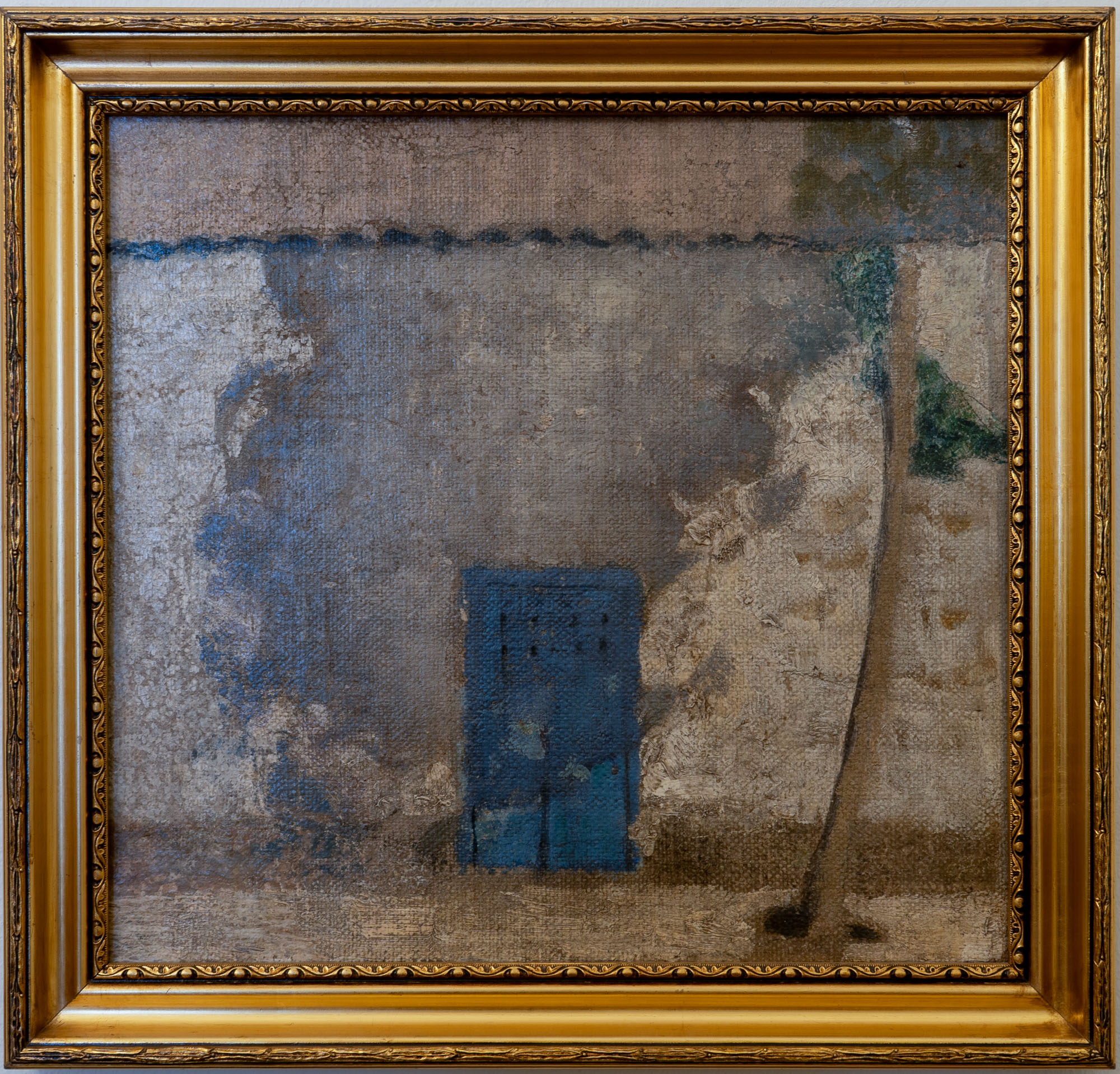 Obra de formato rectangular y orientación horizontal. Composición en base a vista urbana. En primer plano, al lado derecho, hay árbol alto de tronco delgado. En segundo plano, fachada en tono gris y blanco sucio, con puerta azul y tejado.