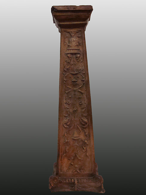 Obra tridimensional, exenta. Escultura vertical con ornamentaciones fitomórficas en sobrerrelieve. La base y parte superior presentan un ancho mayor al cuerpo del pedestal.
