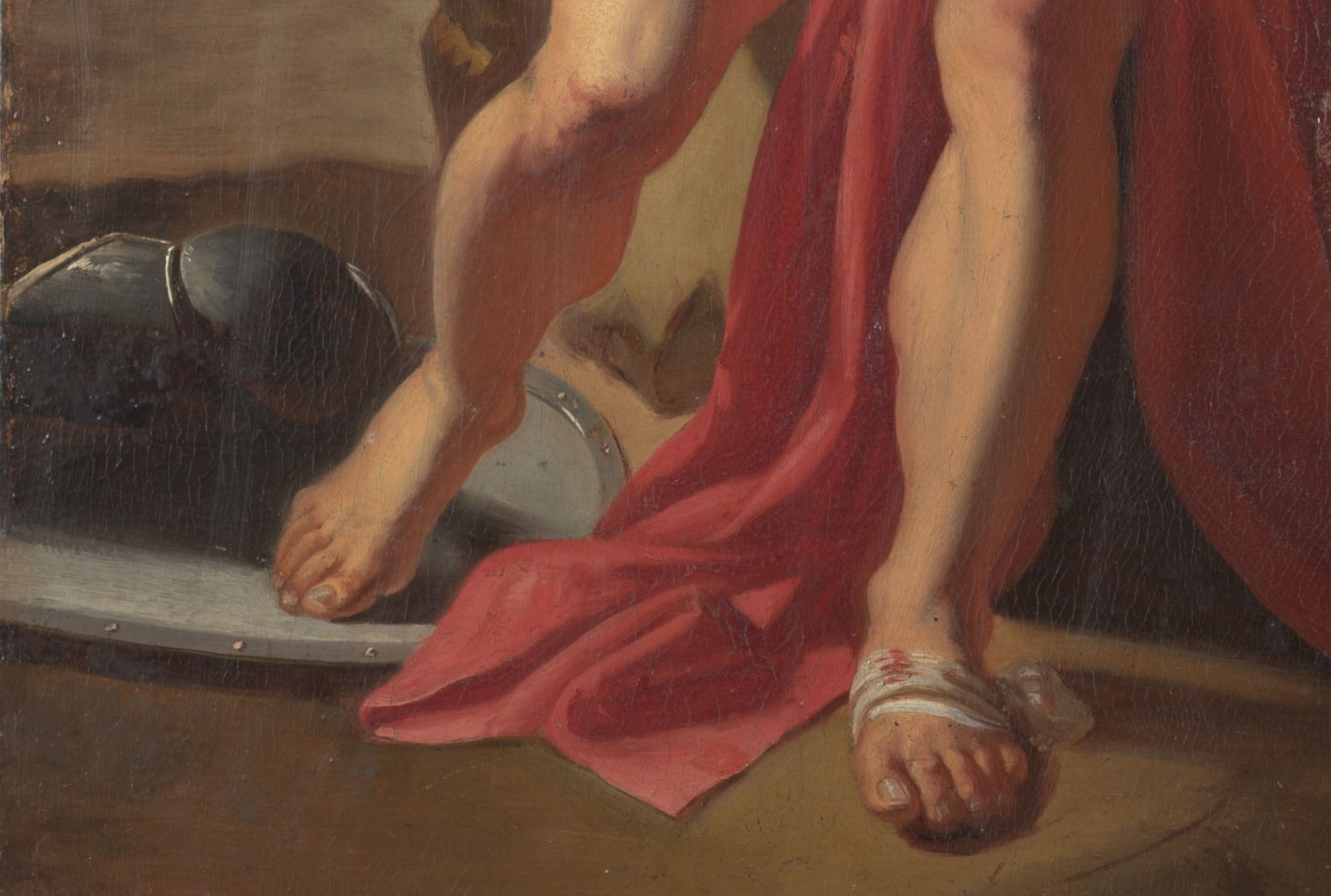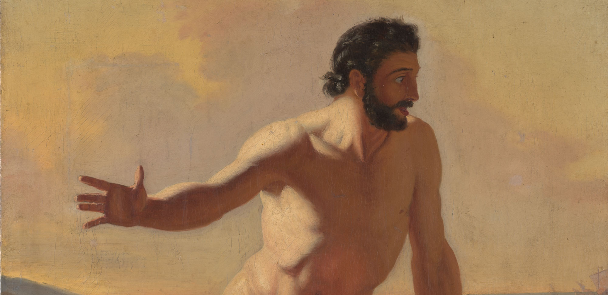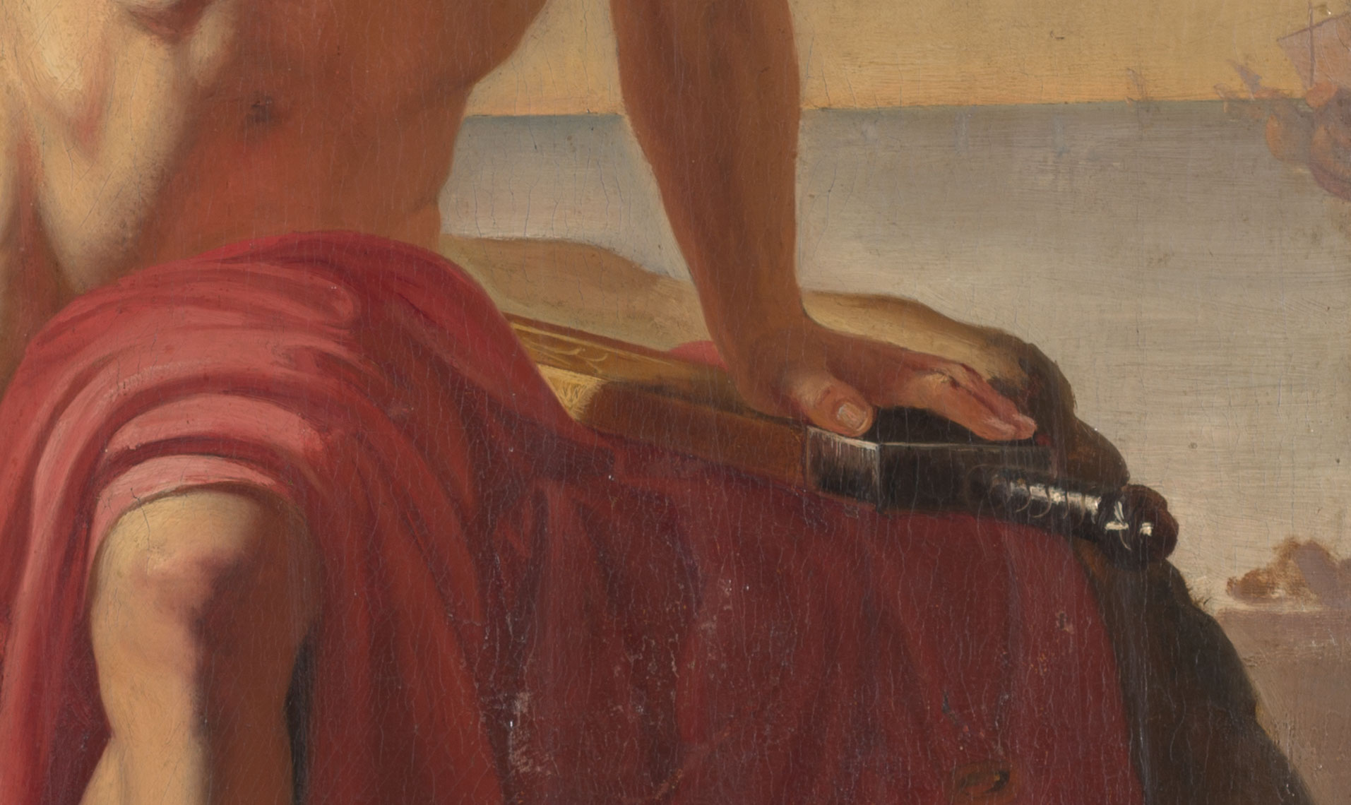 Obra de formato rectangular y orientación vertical. Composición en base a escena exterior. Al centro hay una figura masculina, representada de cuerpo completo de figura masculina sentada sobre una roca. El hombre está semidesnudo, solo cubierto por un manto rojo que cae sobre su sobre pierna derecha. Tiene su cabeza girada a la izquierda y su brazo izquierdo está extendido con la palma abierta. De fondo un paisaje costero.