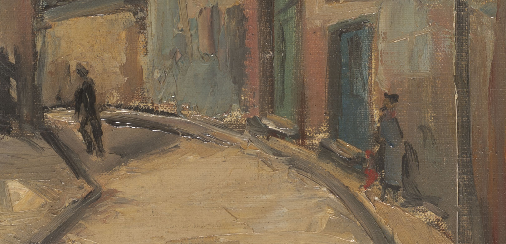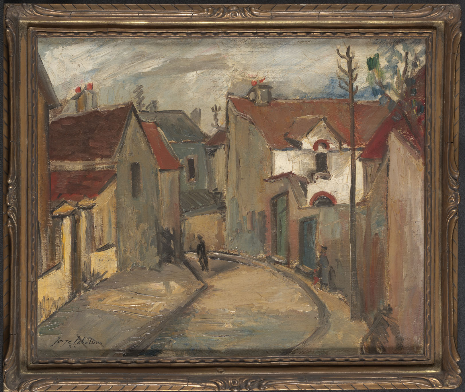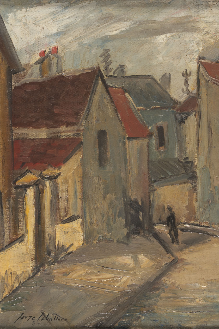 Obra bidimensional, rectangular, orientación horizontal. Paisaje urbano. Composición en base a vista en perspectiva de calle curva con casas en ambos lados. Se distingue figura en la calle y otra en la vereda. Predominio de tonos marrón, gris, ocre verdoso.
