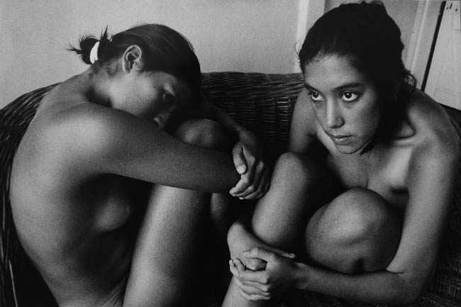Obra rectangular, orientación horizontal. Imagen blanco y negro. Retrato de dos figuras femeninas sentadas con las piernas recogidas. Ambas niñas están desnudas y llevan el pelo negro recogido.