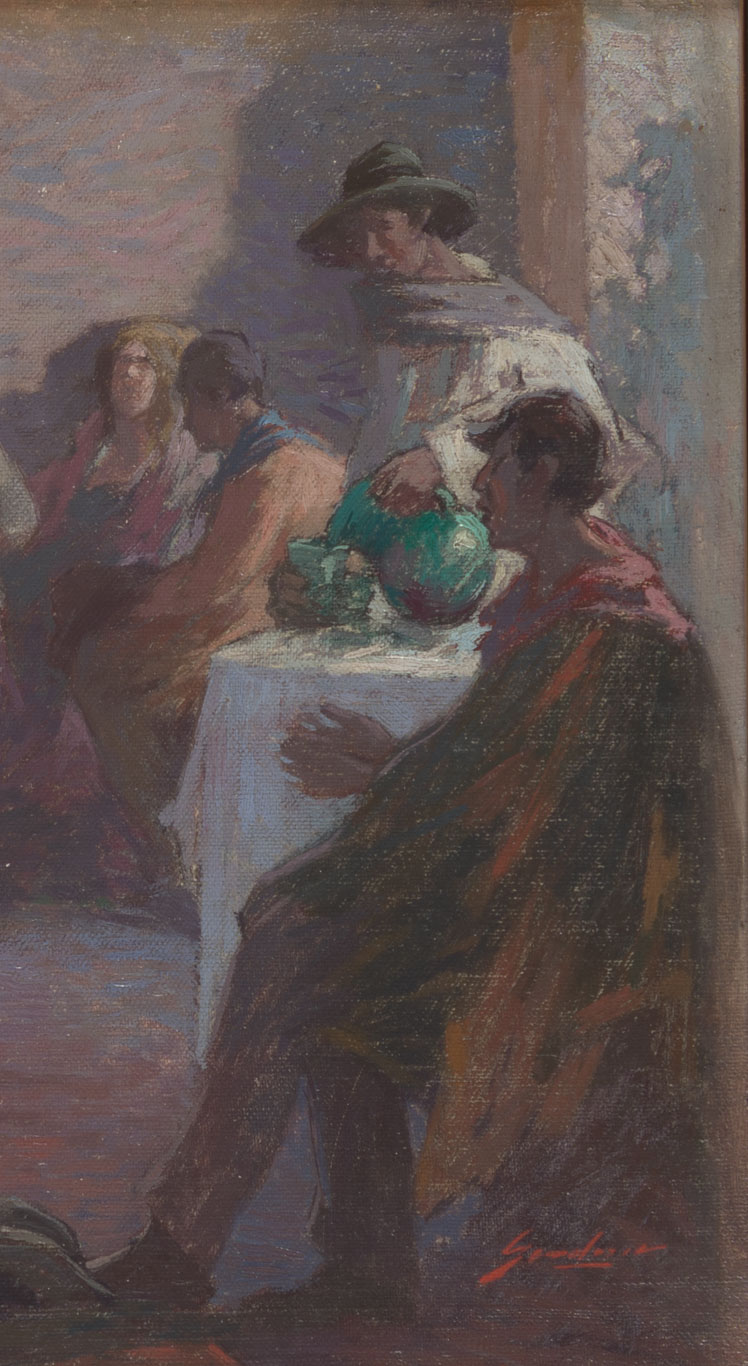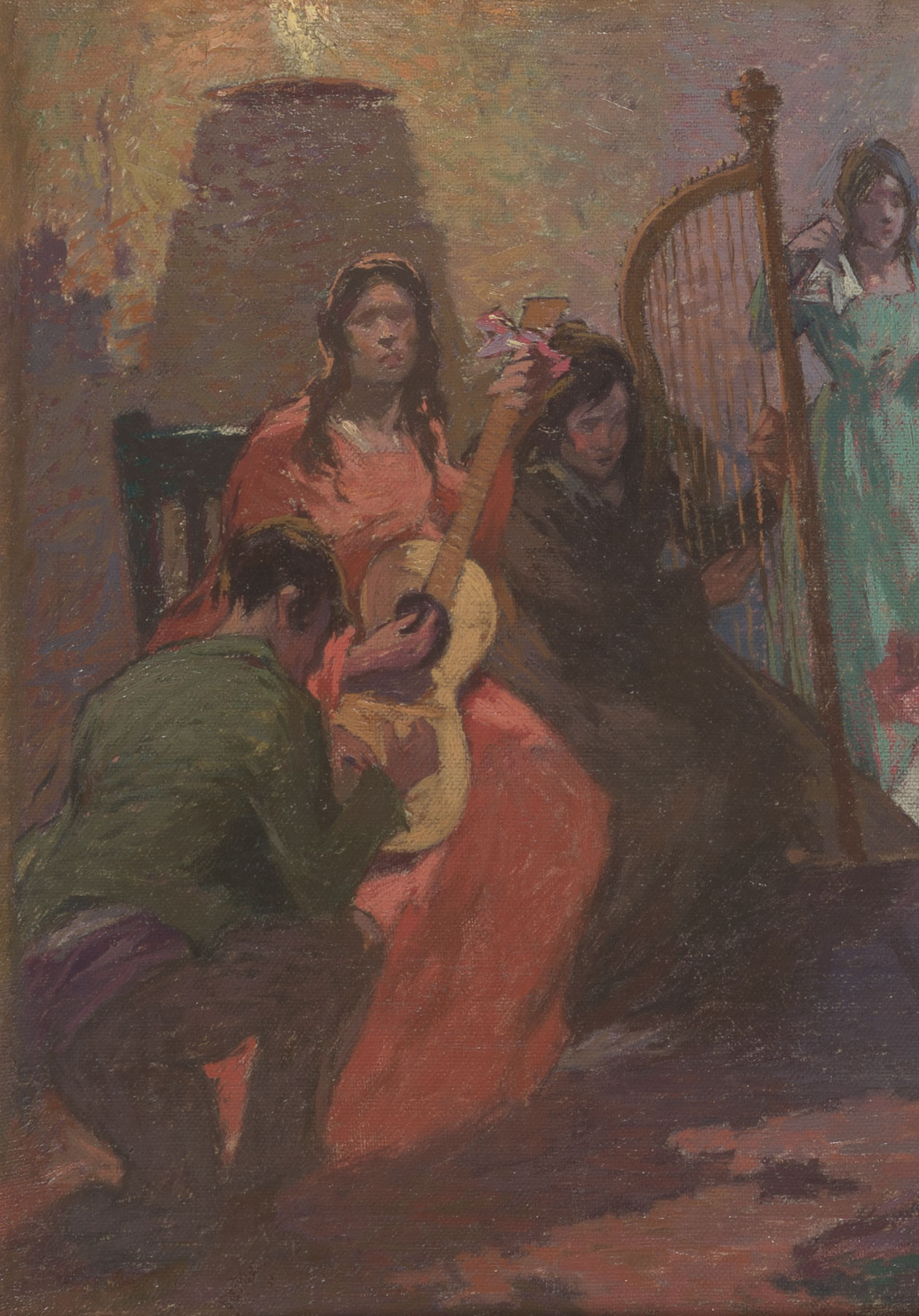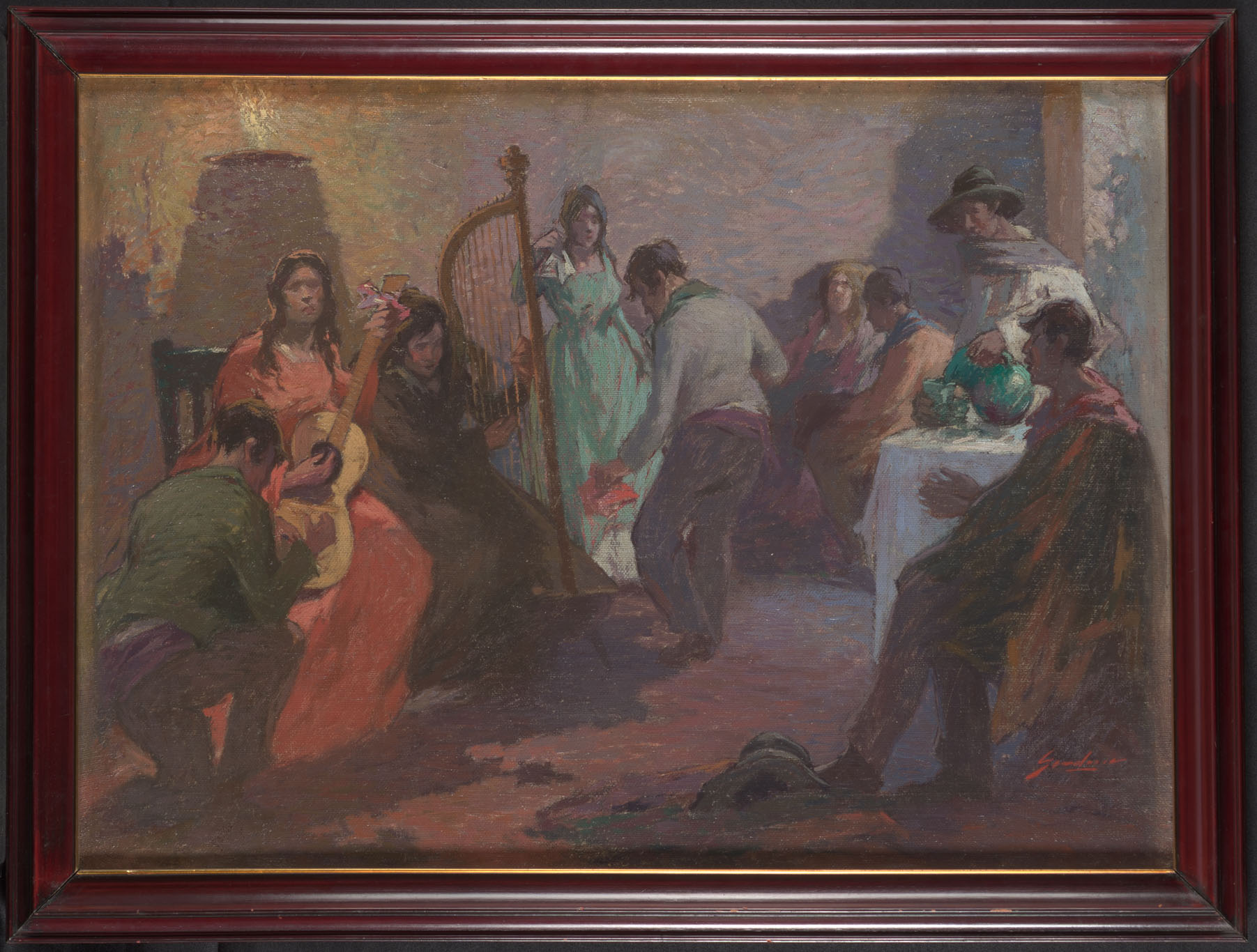 De formato rectangular, composición horizontal en interior, figurativa en que se representa una escena costumbrista al interior de un salón/taberna de pueblo en que se ve a variados personajes en distintas posturas, de baile y tocando instrumentos como arpa y guitarra. Las vestimentas de los personajes son brillantes, colores fuertes, luz que genera una atmósfera cálida. En primer plano mujer de vestido anaranjado sentada,que toca la guitarra en extremo izquierdo delante de ella personaje masculino hincado en su rodilla derecha. Al centro un personaje masculino bailando frente a la mujer que toca un arpa.