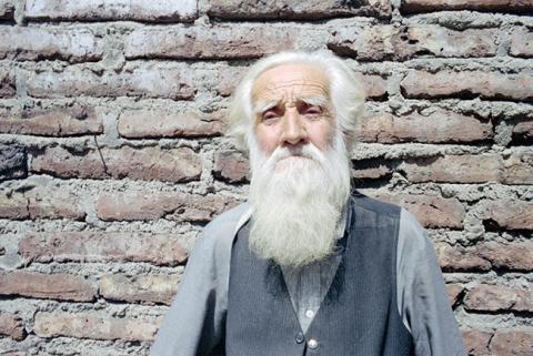 Obra rectangular y orientación horizontal. Composición en base a seis retratos fotográficos verticales y uno horizontal de figura masculina vista desde distintos ángulos. El retratado es un hombre de edad avanzada con el pelo y barba cana apoyado contra un muro de ladrillo.