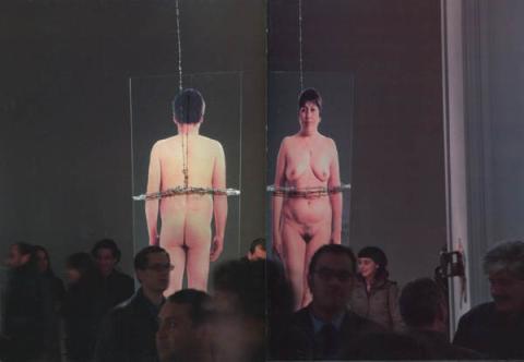 Instalación compuesta por dos rectángulos de vidrio que penden del techo colgados con alambre de púas. Cada plancha tiene la imagen de de una figura femenina y masculina desnuda respectivamente, por delante y por detrás.