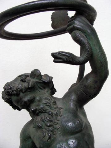 Obra tridimensional. Escultura de bulto en formato vertical. Composición en base a figura masculina de pie sobre una base circular, sosteniendo una serpiente con su mano izquierda. El retratado se representa con una corona de ramas de vid sobre la cabeza, barba y semidesnudo. La figura sostiene con su brazo alzado una serpiente en forma de aro.
