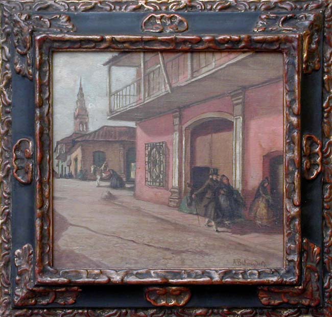 De formato cuadrado, composición vertical en exterior que representa en primer plano calle adoquinada, en sentido diagonal a la derecha tres figuras, dos femeninas y una masculina, visten traje de época colonial, las mujeres vestidos amplios con tocados en el pelo, moños y peinetones, puntillas negras, el hombre de traje oscuro, sombrero de copa y bastón.Calle empedrada y fachada de casa con balcón de la época de Santiago antiguo. En calle al fondo personaje masculino a caballo color blanco. En último plano torre de iglesia.