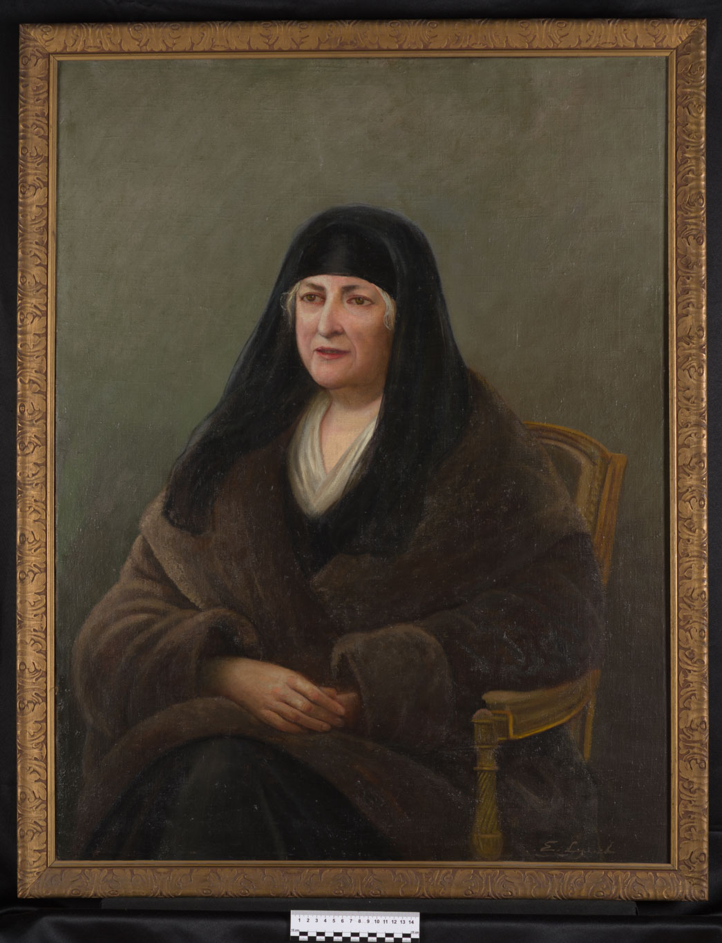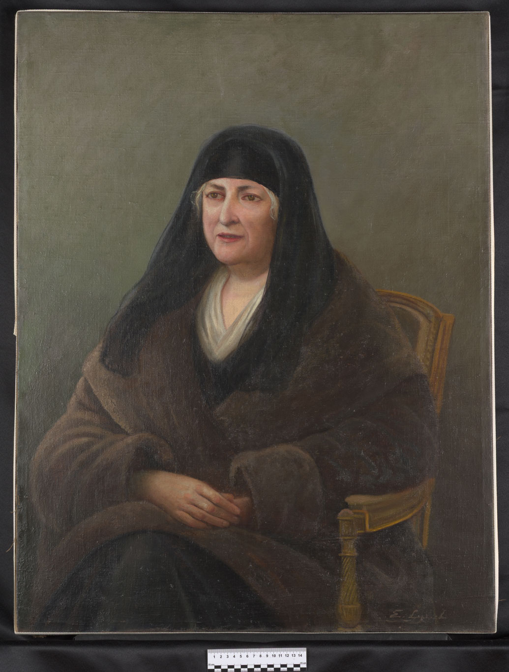 Obra rectangular, orientación vertical. Retrato de figura femenina sentada, medio cuerpo, con las manos sobre su falda. La mujer lleva un manto negro que le cubre su pelo canoso y un abrigo café. Fondo gris.