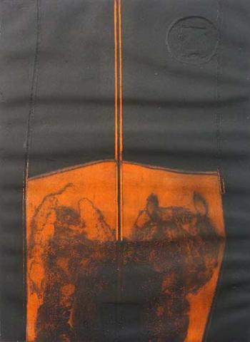 Obra de formato rectangular de orientación vertical (Dimensión de la imagen 49,5 x 34,5cm). Grabado abstracto, en la zona inferior central de la obra una forma abstracta color naranjo, destacan dos líneas paralelas hacia el margen superior de la obra. El fondo del grabado es de color negro.
