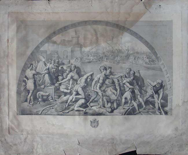 Las láminas fueron impresas por Angelo Biggi. Esta obra reproduce una pintura al fresco de la Estancia del Incendio del Borgo. Procede de un libro con 37 estampas que representan 19 murales de Rafael Sanzio y Lucca Signorelli pintados en las Estancias Vaticanas así como 18 tapices basados en diseños de Rafael, en edición promovida por el Caballero Pietro Brognoli, que se publicaron entre 1870/1880.